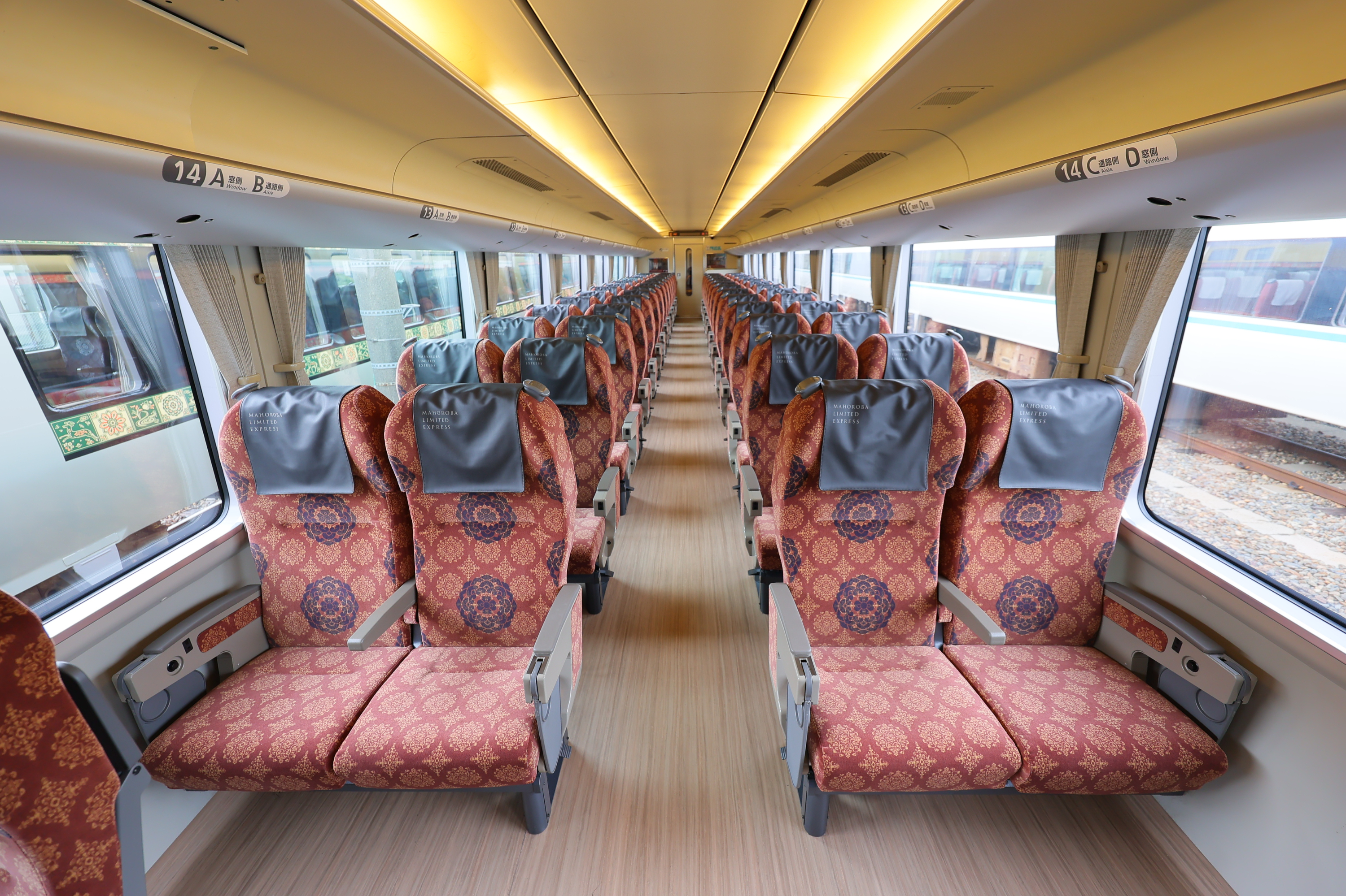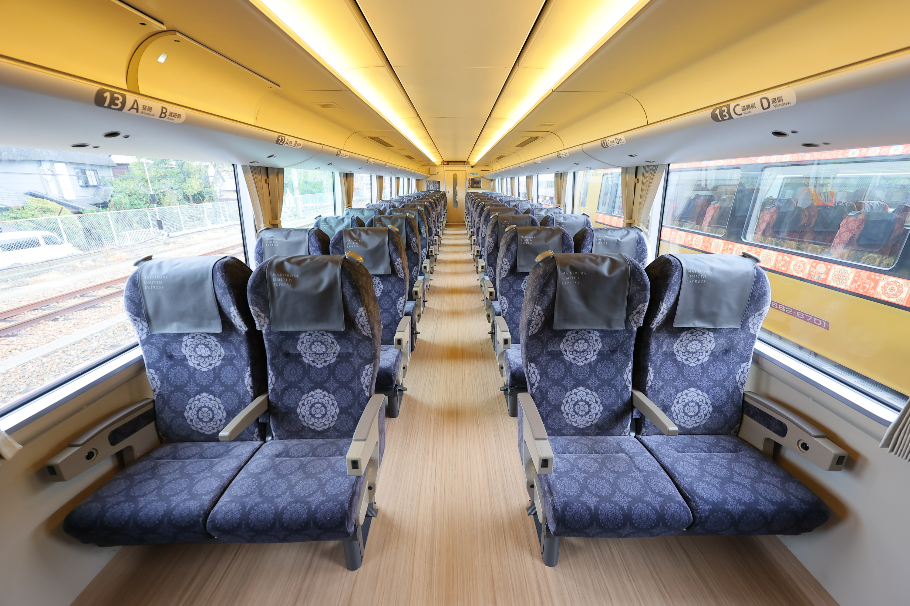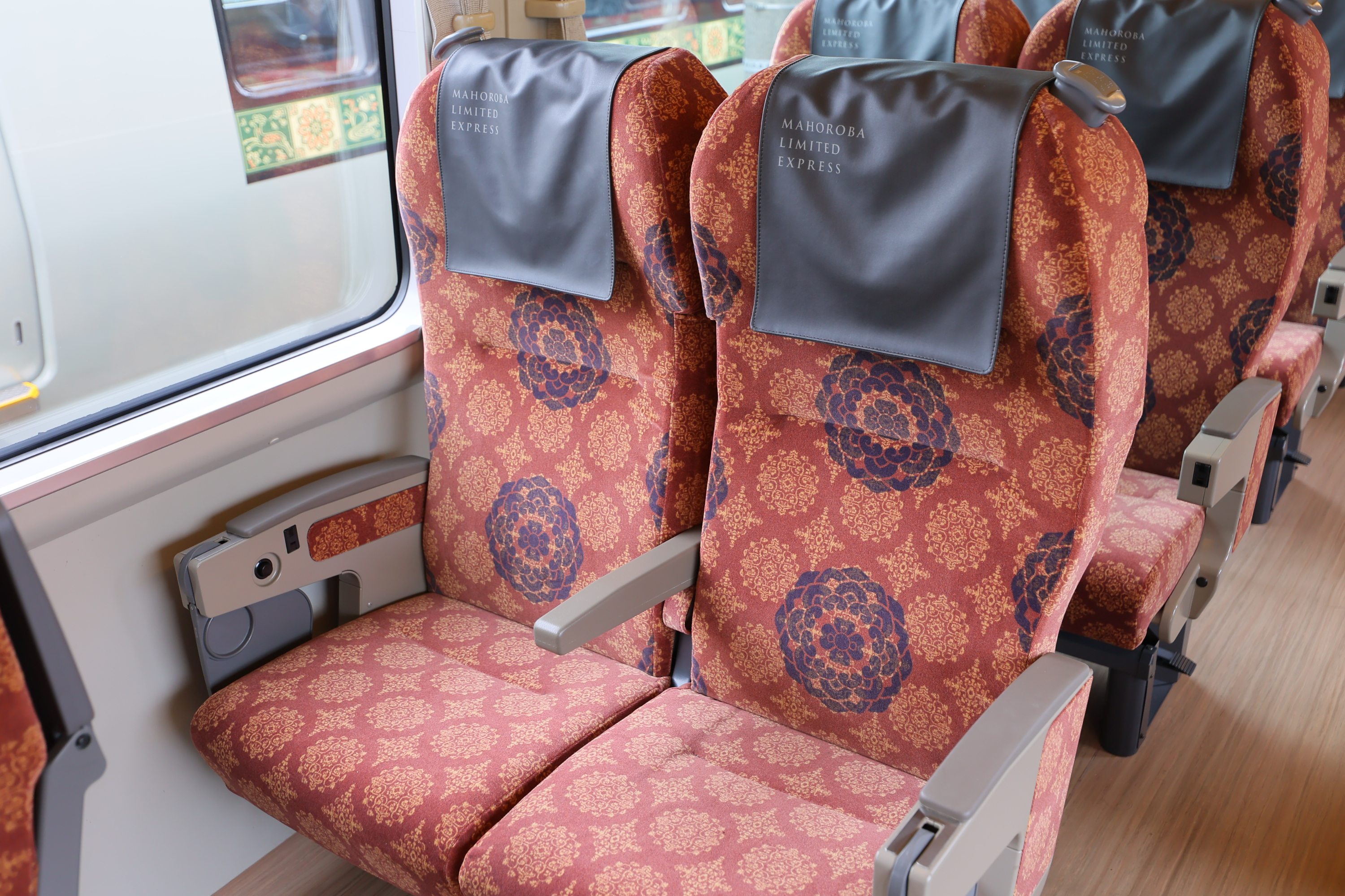 以前の臨時特急「まほろば」は、特急「くろしお」などで使用の287系でしたが、定期運行化にあわせ683系をリニューアルした専用編成に。車両の内外装に奈良の魅力を表現、車内 Wi-Fi・全席にコンセント設置、デッキにはミニギャラリーを設置しています。