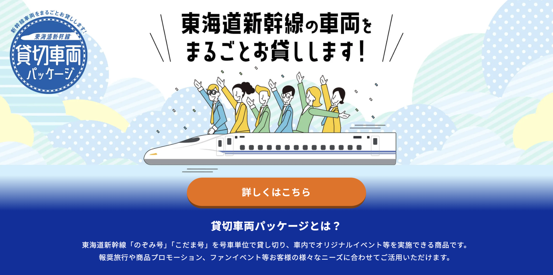 東海道新幹線貸切車両パッケージは、東海道新幹線「のぞみ号」「こだま号」を号車単位で貸し切り、車内でオリジナルイベント等を実施できる商品で、報奨旅行や商品プロモーション、ファンイベントなど、さまざまな使い方ができます。