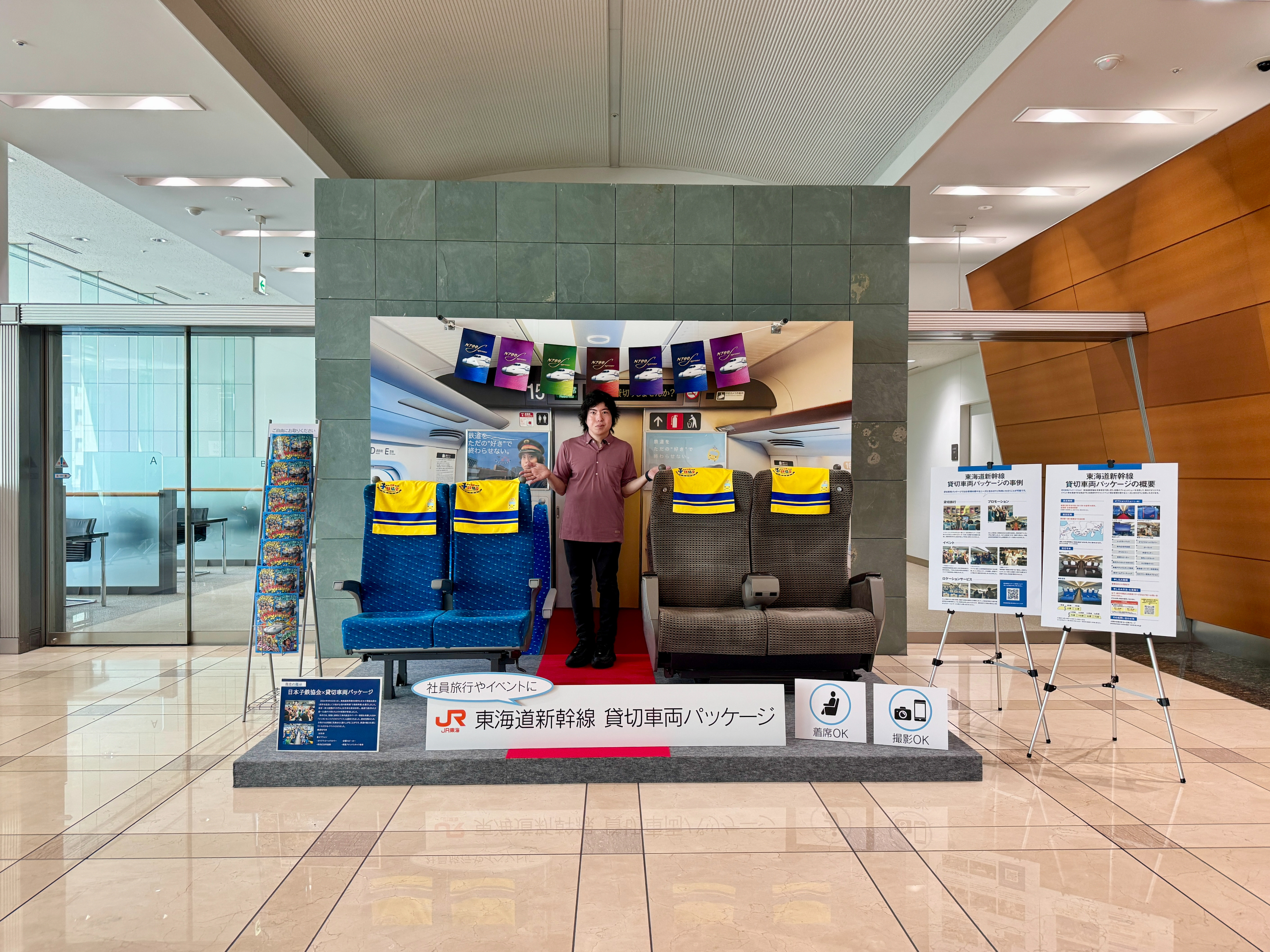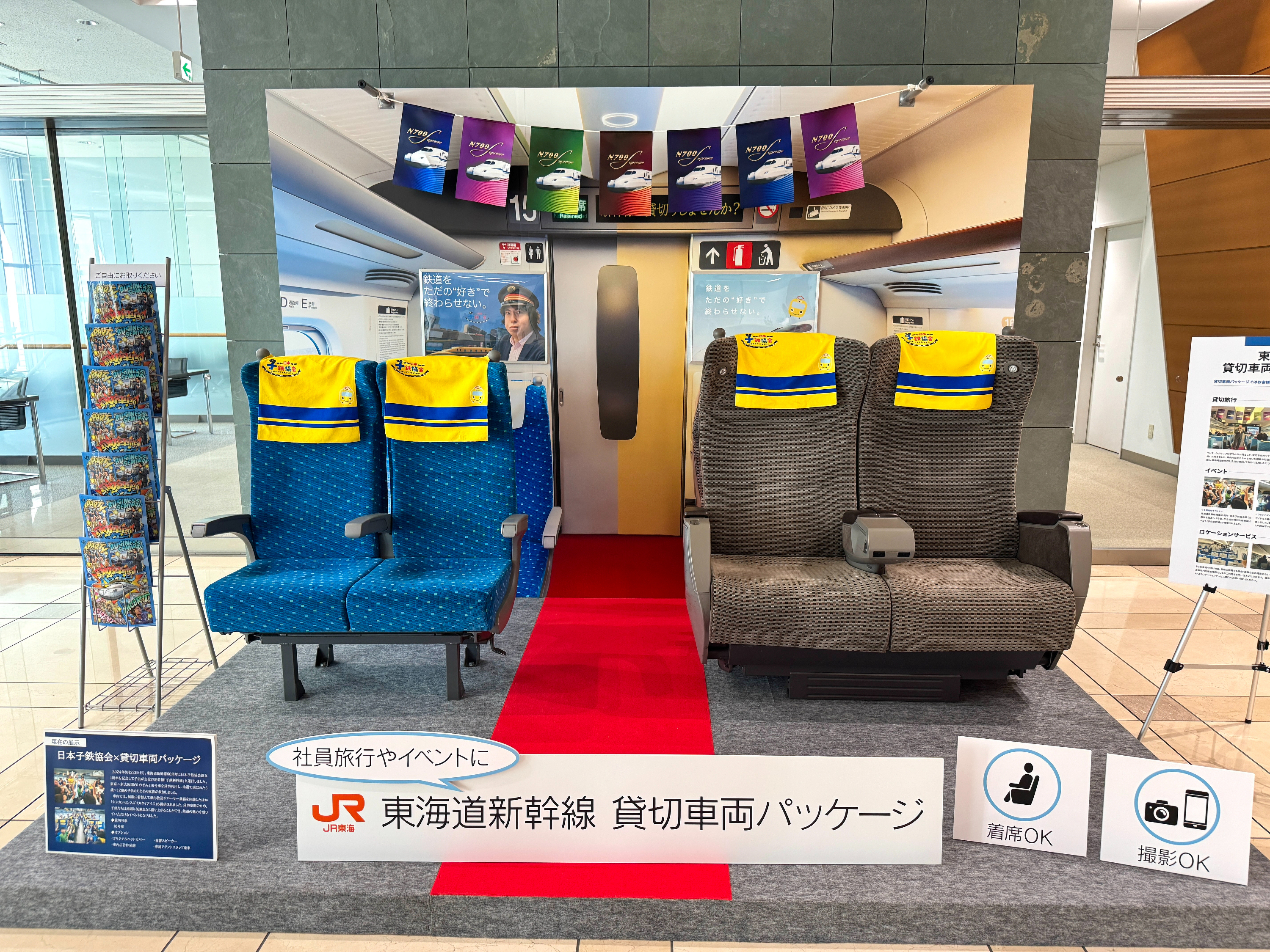 これは、JR東海 東京本社内に設置されている東海道新幹線貸切車両パッケージのPRコーナーで、本物の新幹線座席(普通車・グリーン車)も設置した本格的な展示です。