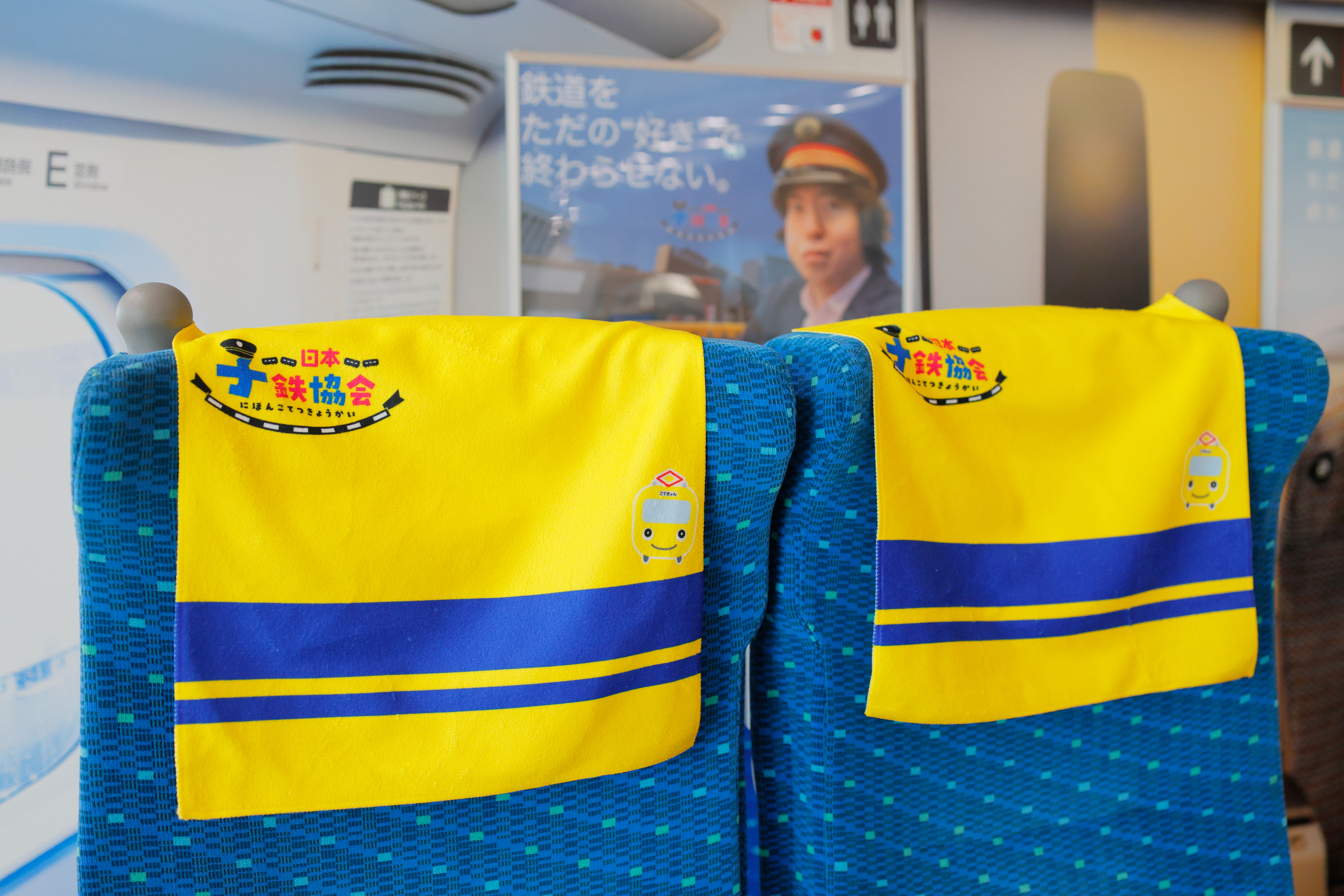 子鉄新幹線オリジナルの黄色い枕カバーや、オリジナル車内広告を再現しています。(レッドカーペット・ガーランドは貸切パッケージとしてのイメージです)