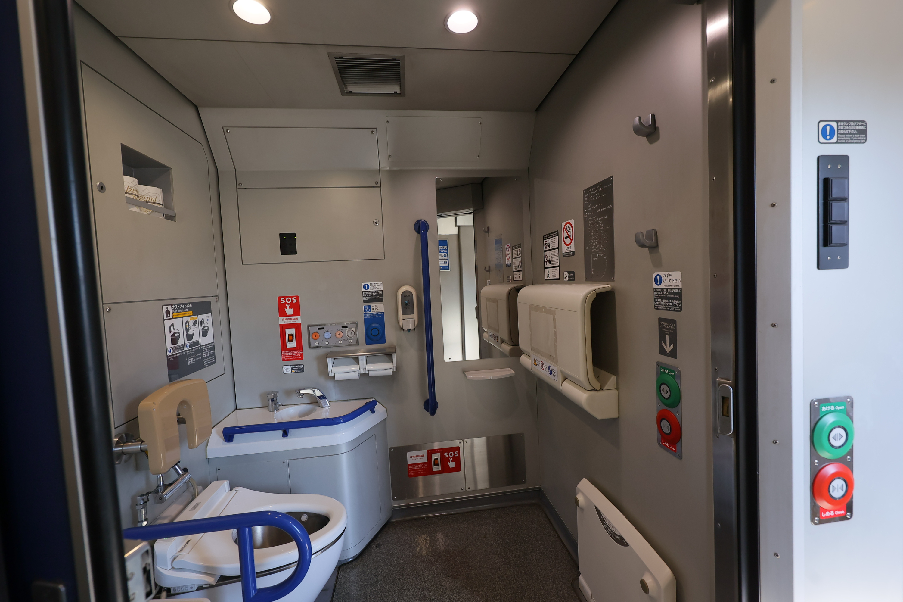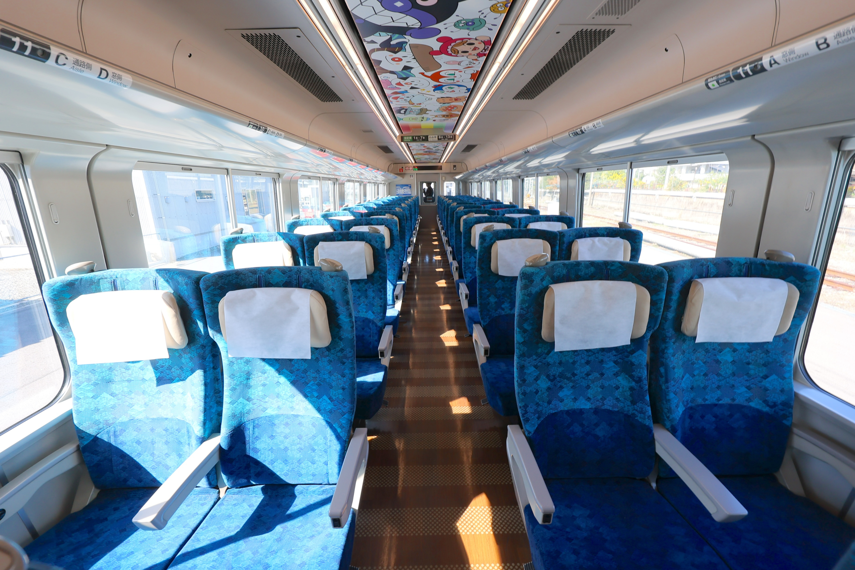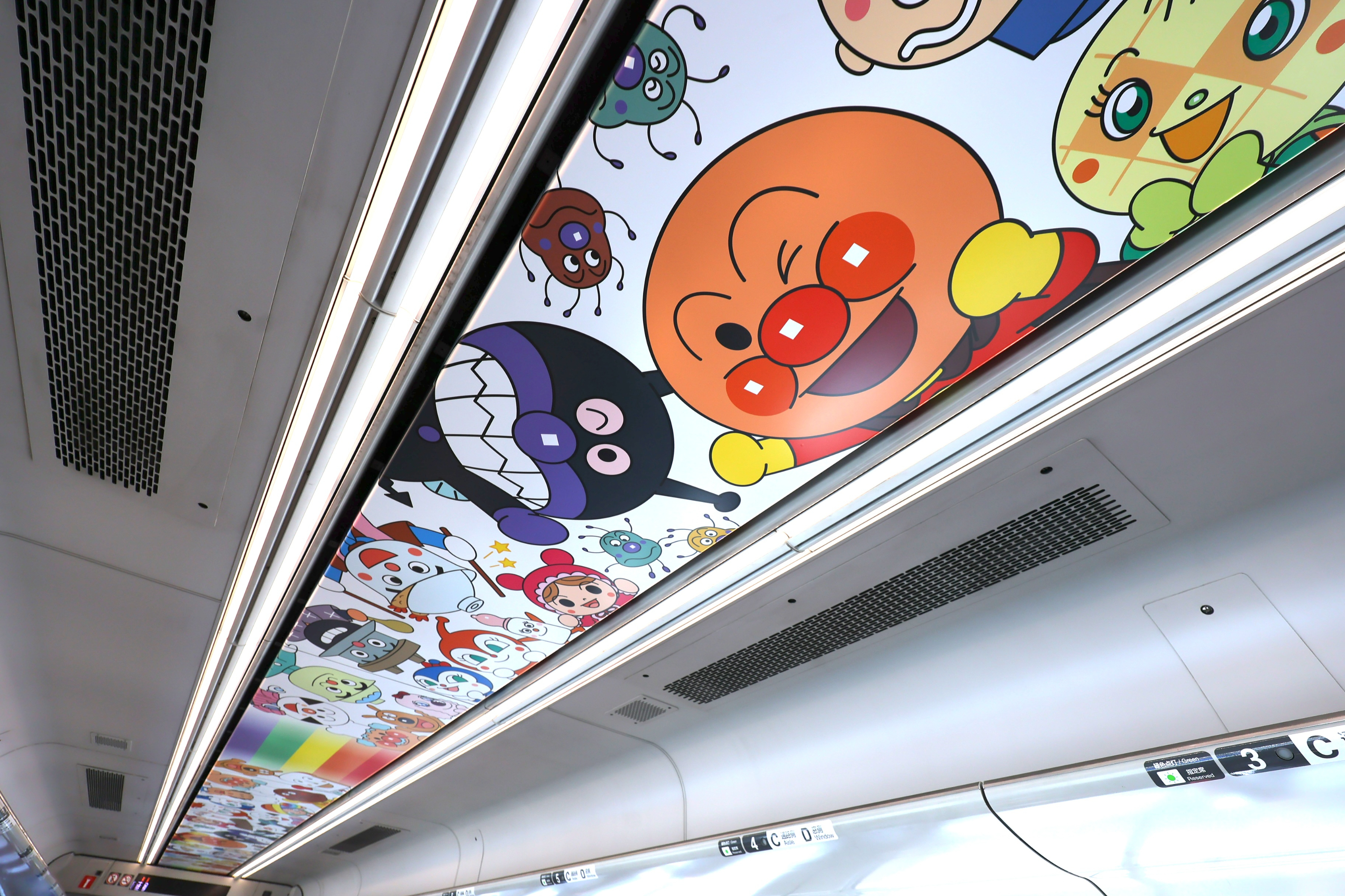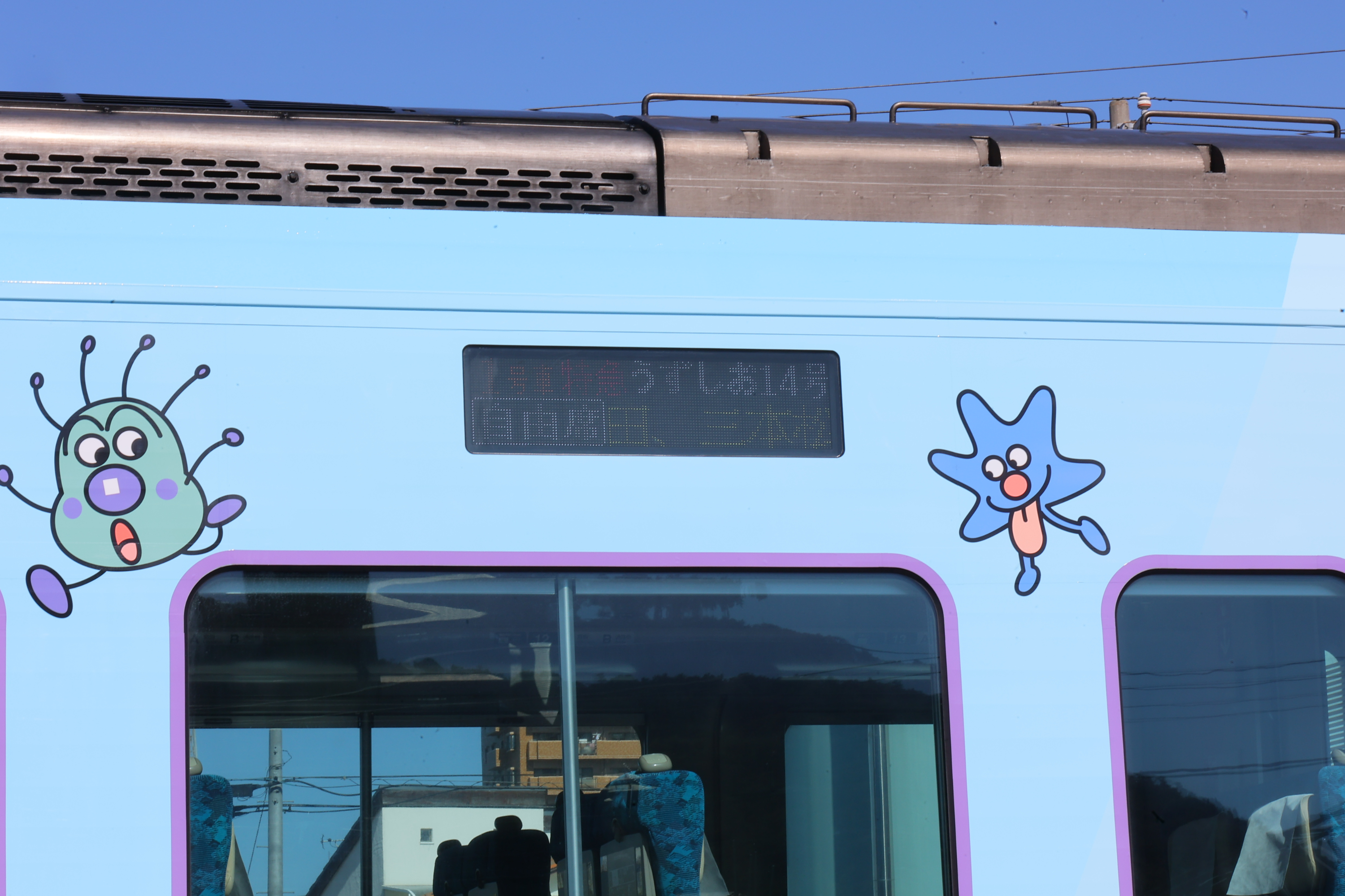 ブルーの車両は、前面に大きく「バイキンマン」が描かれたデザインになっています。また車内は天井にアンパンマンやなかまたちがデザインされているほか、自動放送でもアンパンマンの声が流れます。