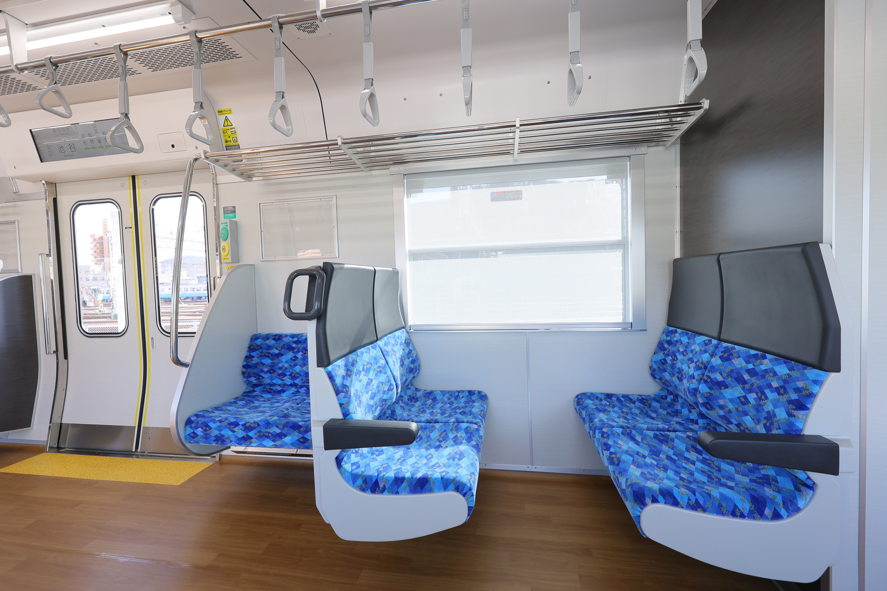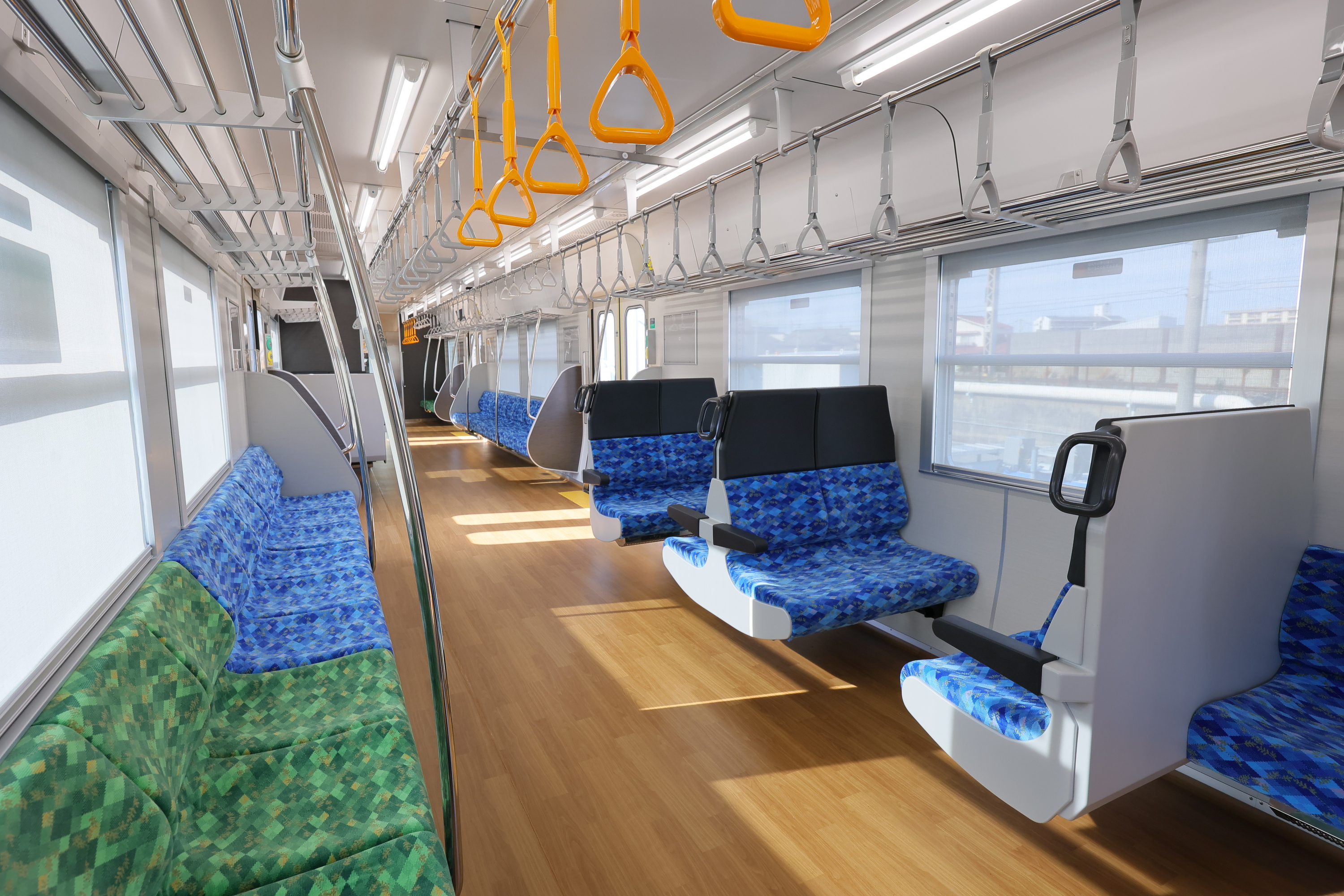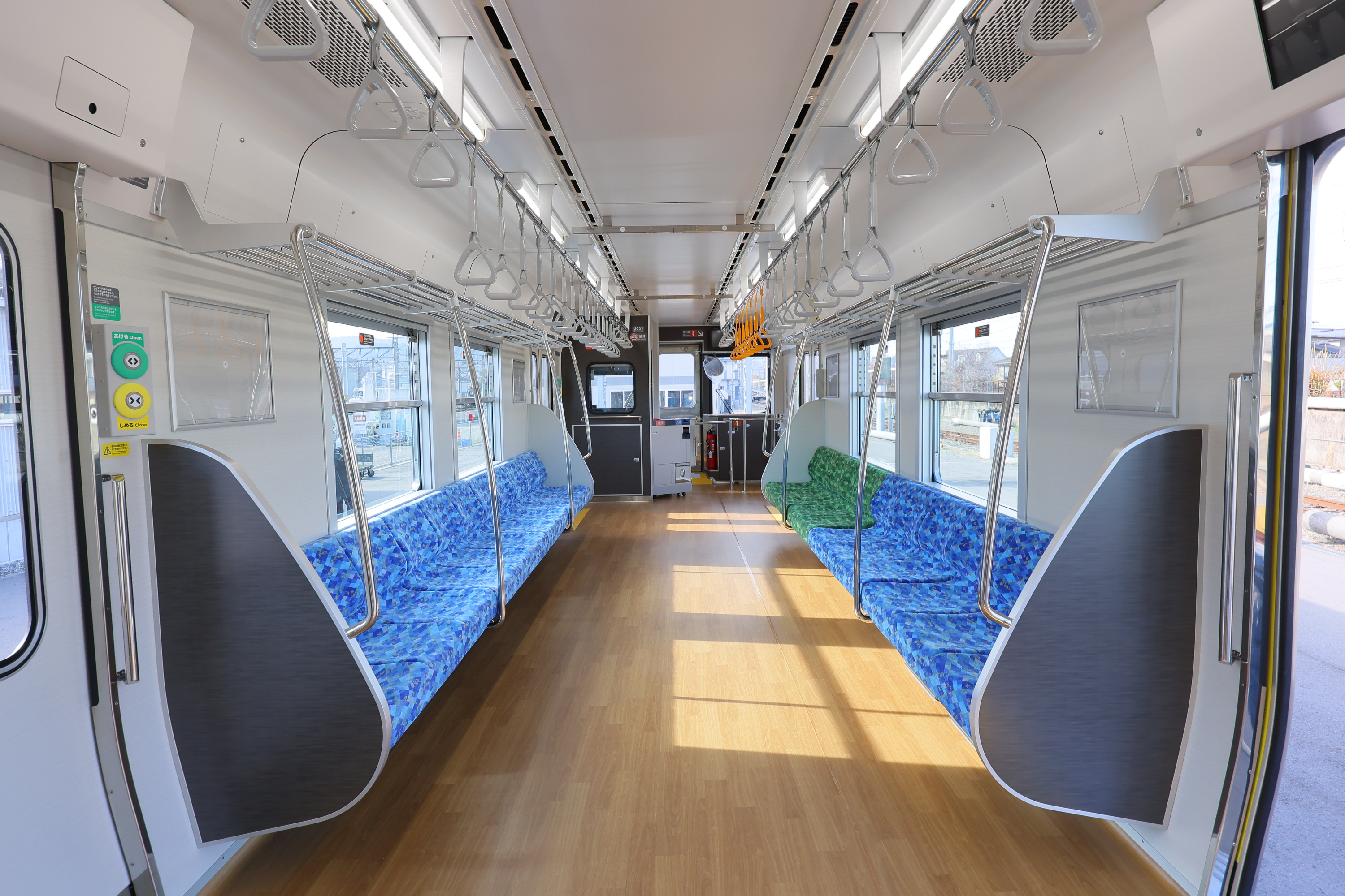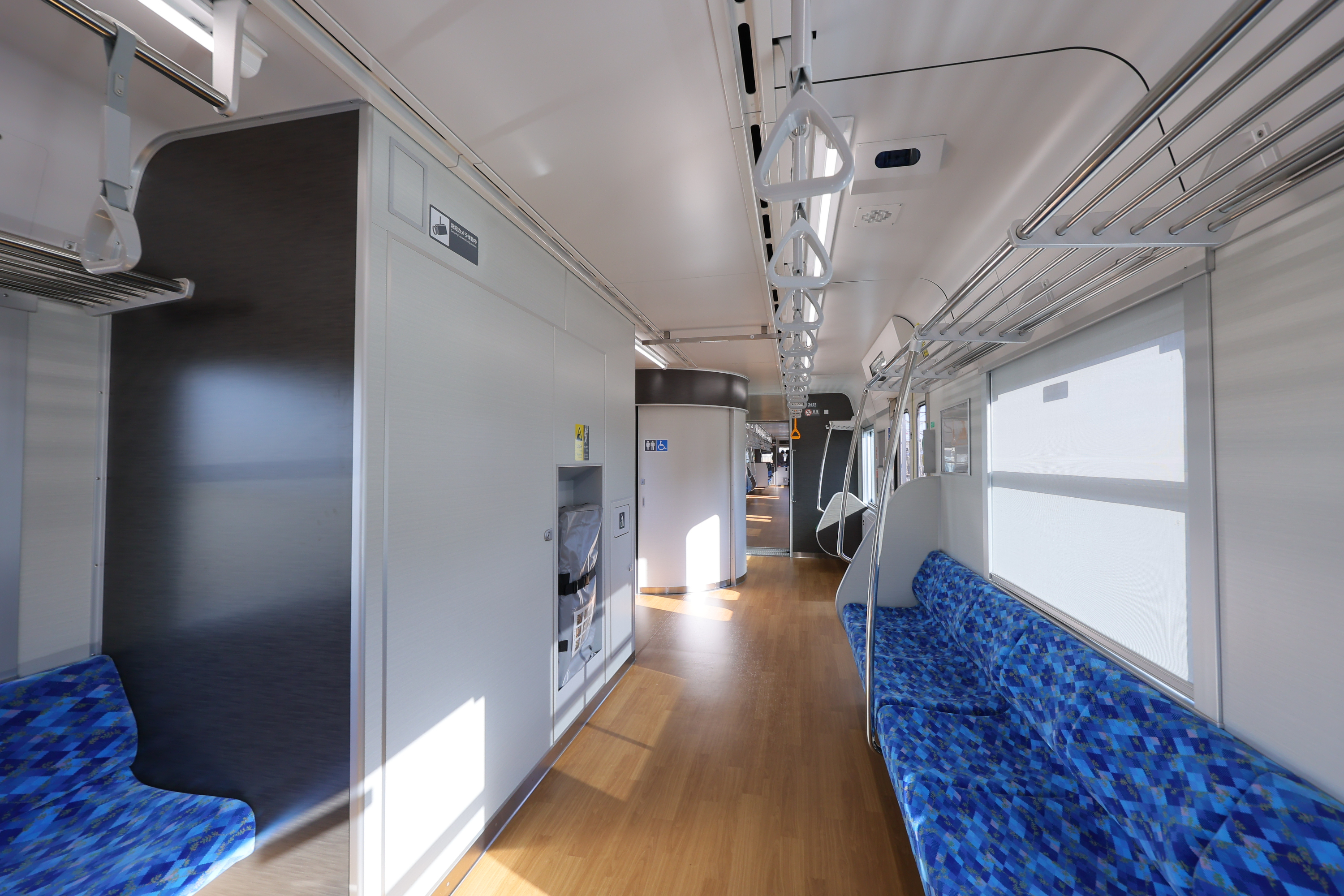 車内は温かみを感じる木目調の床で、四国の海や空をイメージしたブルーの爽やかな座席が並びます。また、液晶案内表示や防犯カメラ、車いすスペースや車いす対応トイレも設置しています。