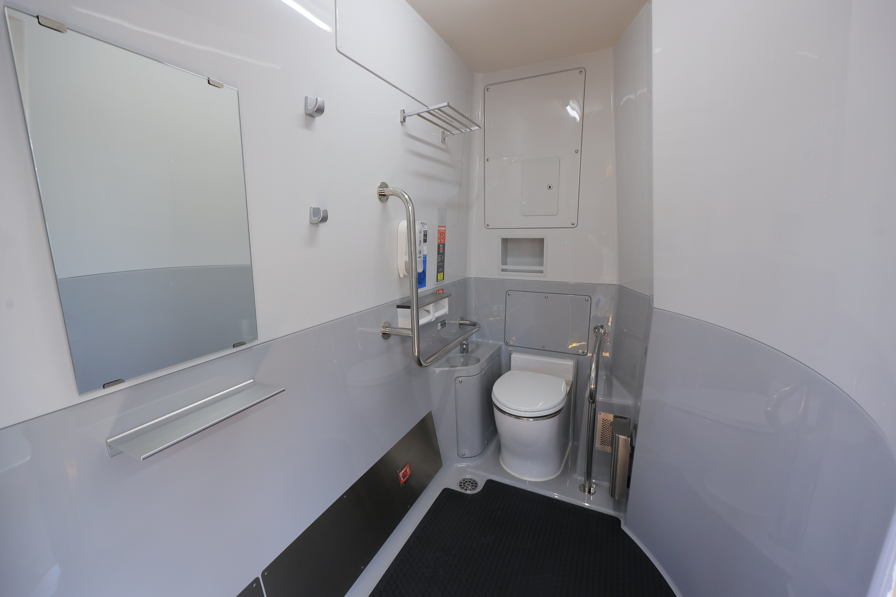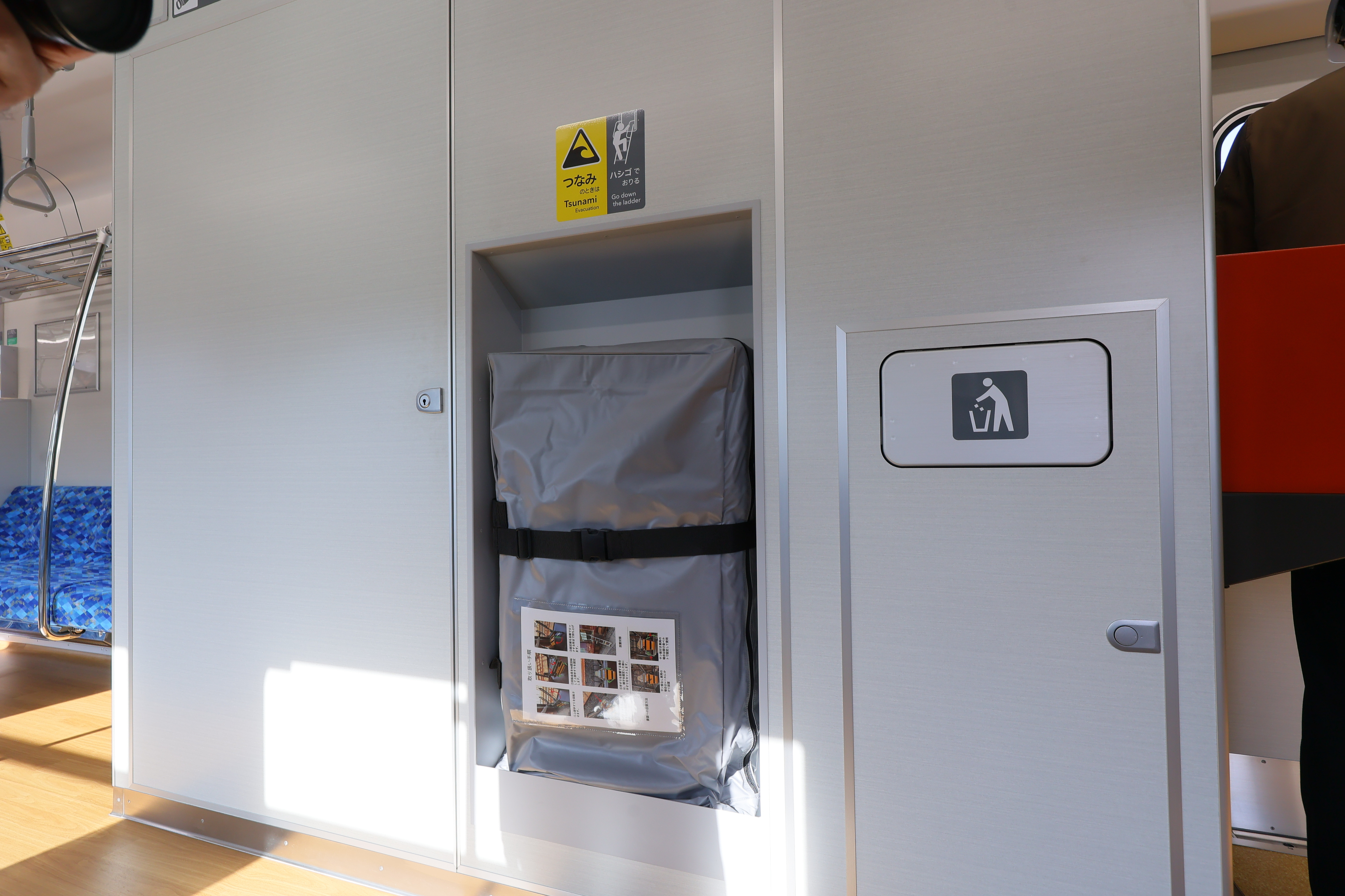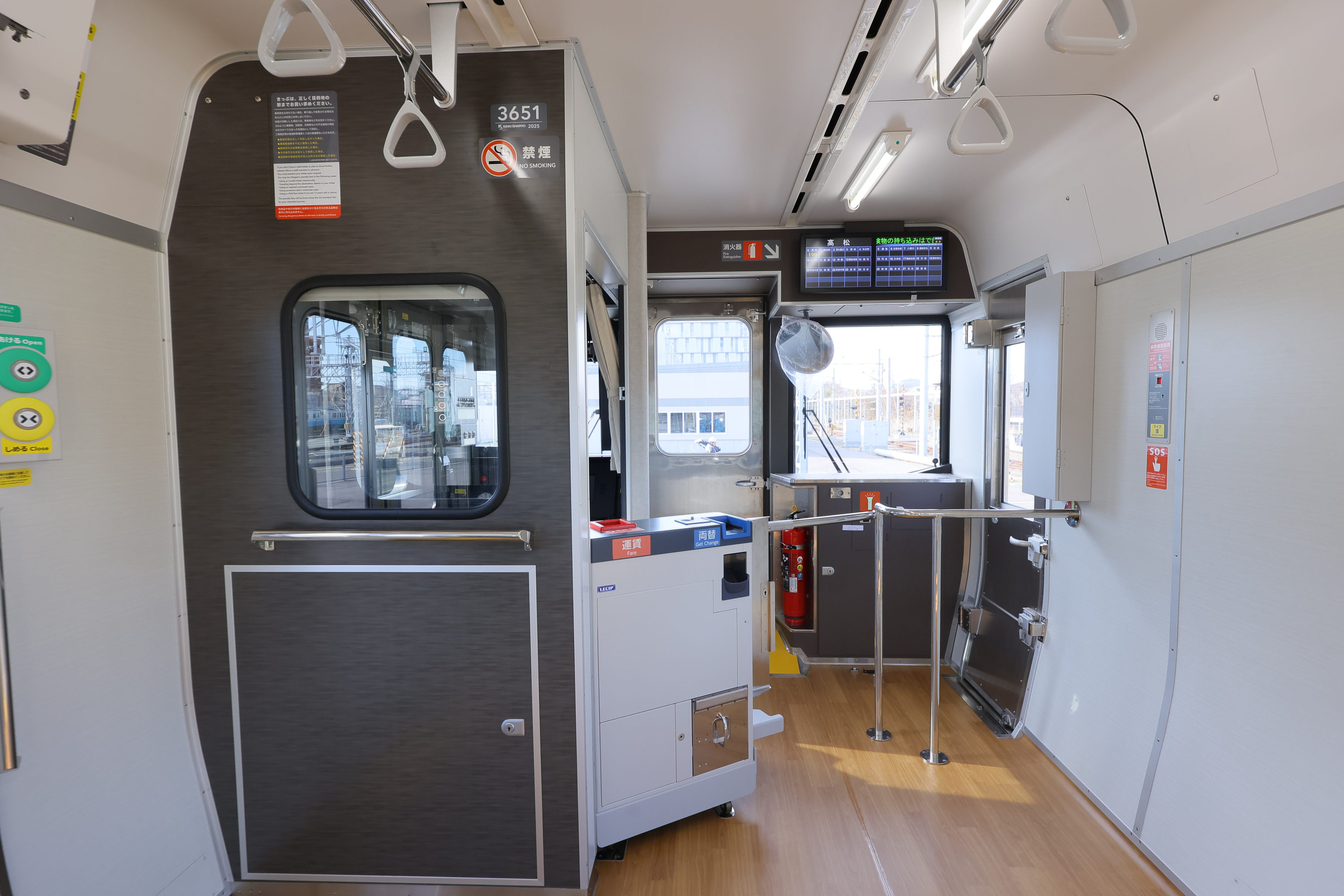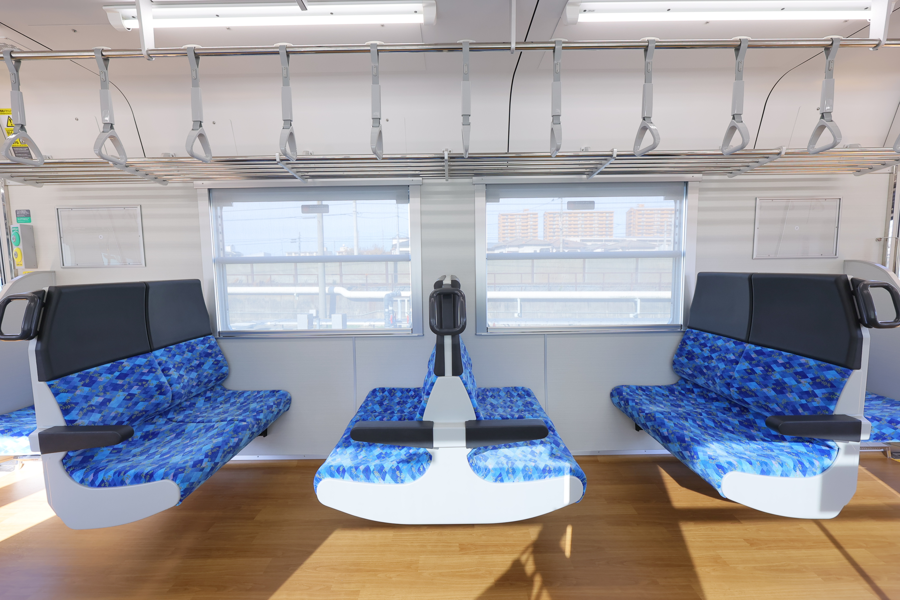 車内は温かみを感じる木目調の床で、四国の海や空をイメージしたブルーの爽やかな座席が並びます。また、液晶案内表示や防犯カメラ、車いすスペースや車いす対応トイレも設置しています。
