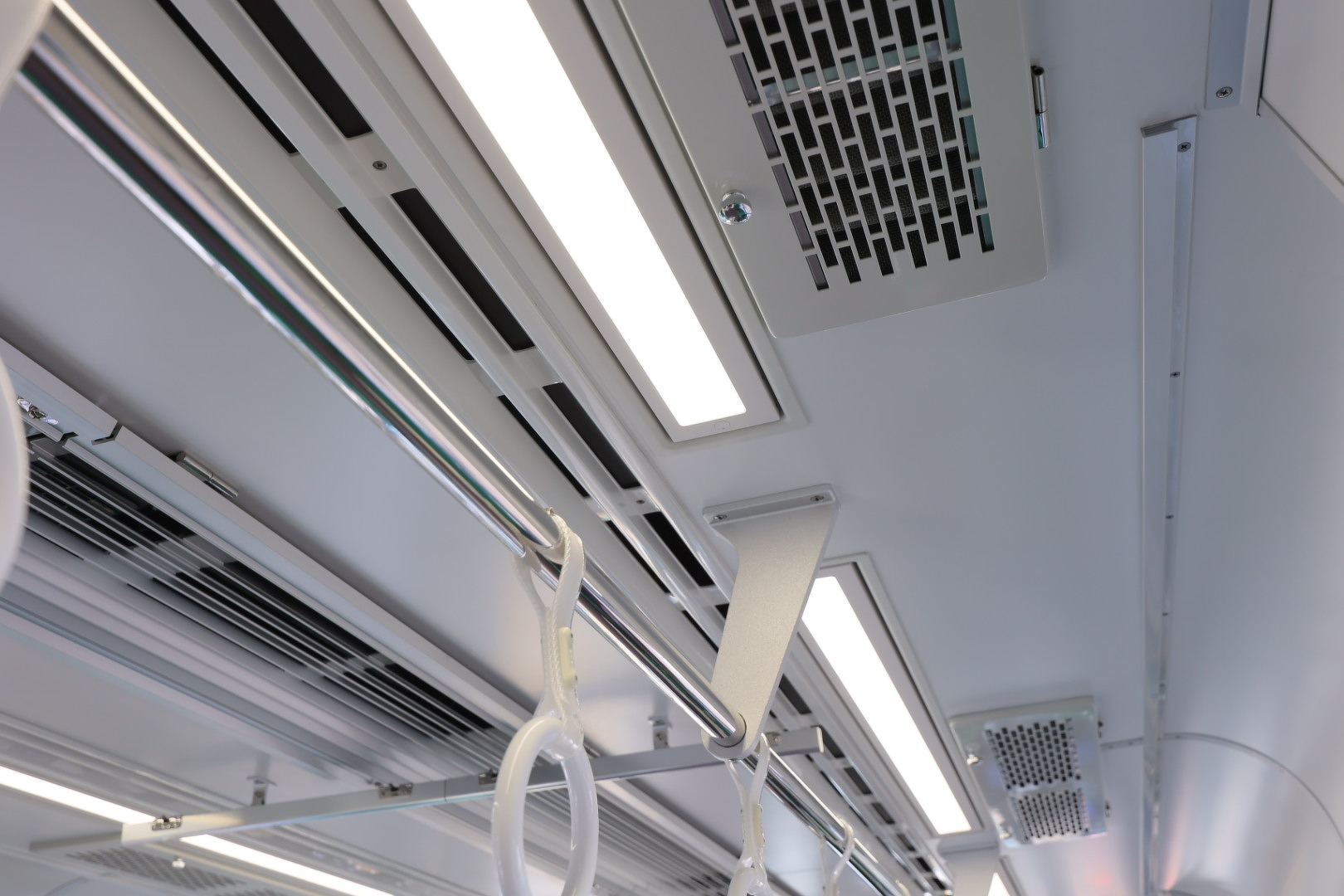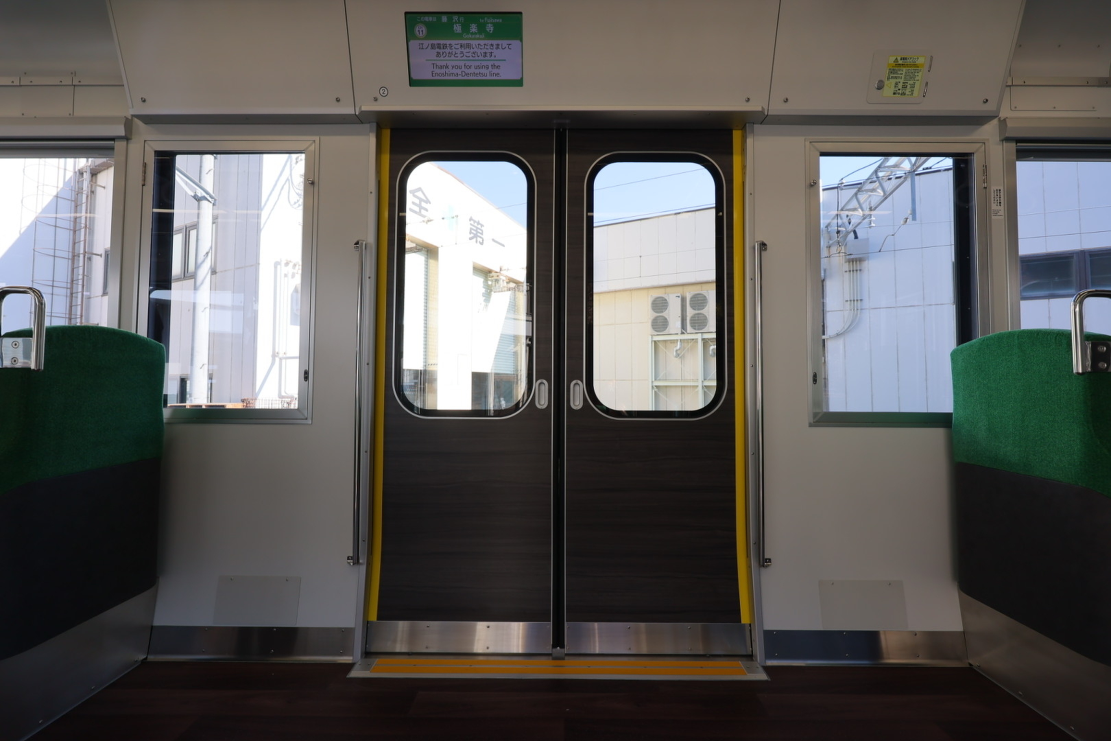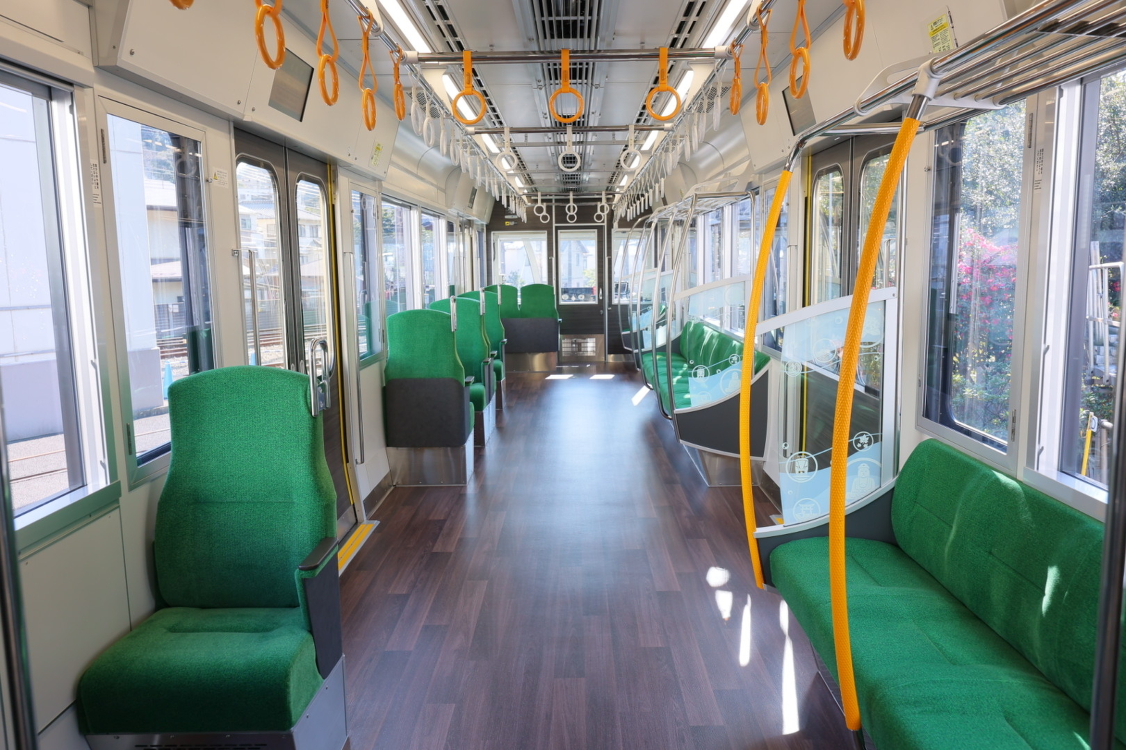 座席や床の色は鎌倉・江の島をイメージした色合いに。3パターンあり、編成によって異なります。また車内防犯カメラや車両側面カメラを設置。窓には鉄道車両で初めて採用するフィルムを貼り、眩しさを抑え色鮮やかな景色を楽しめます。