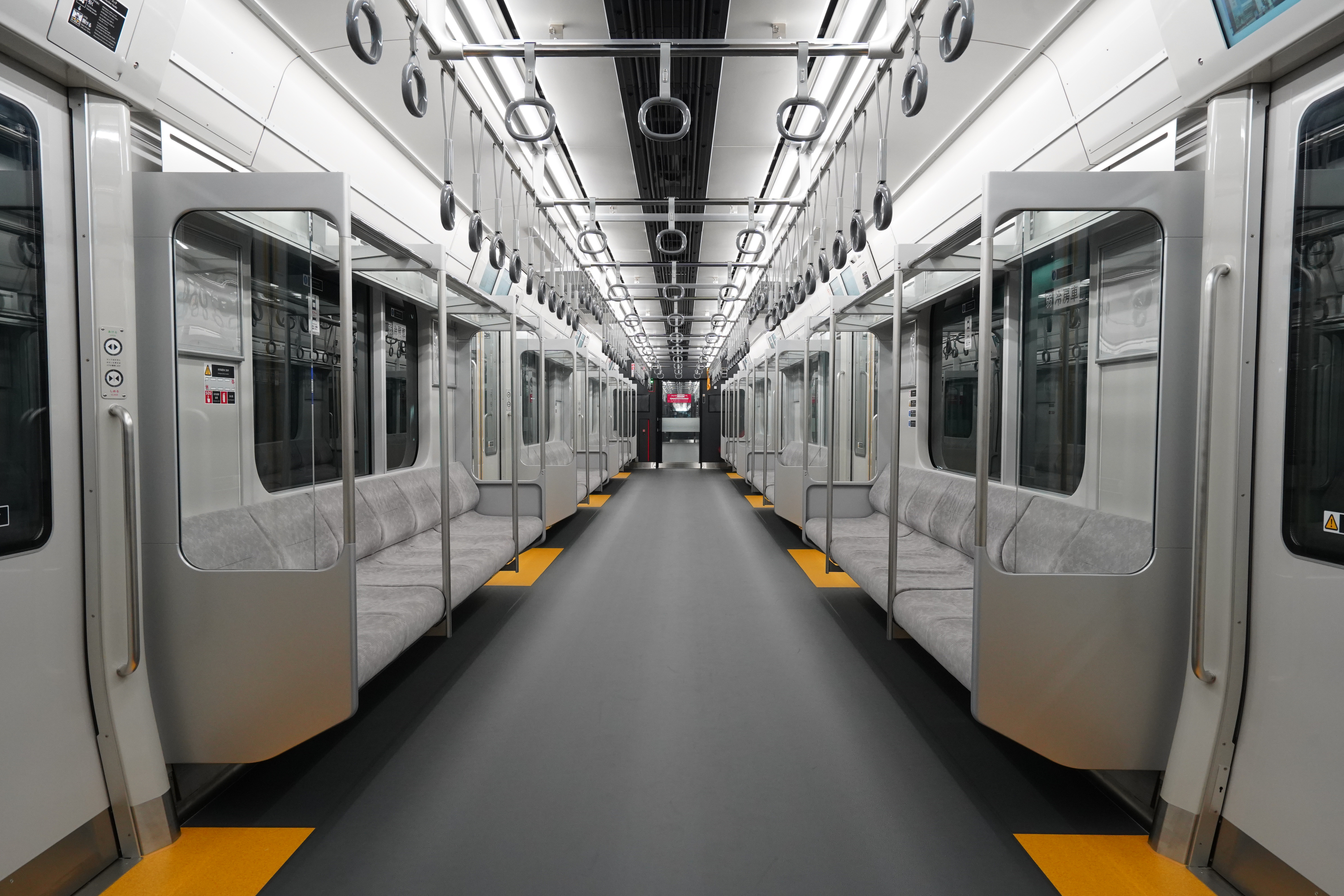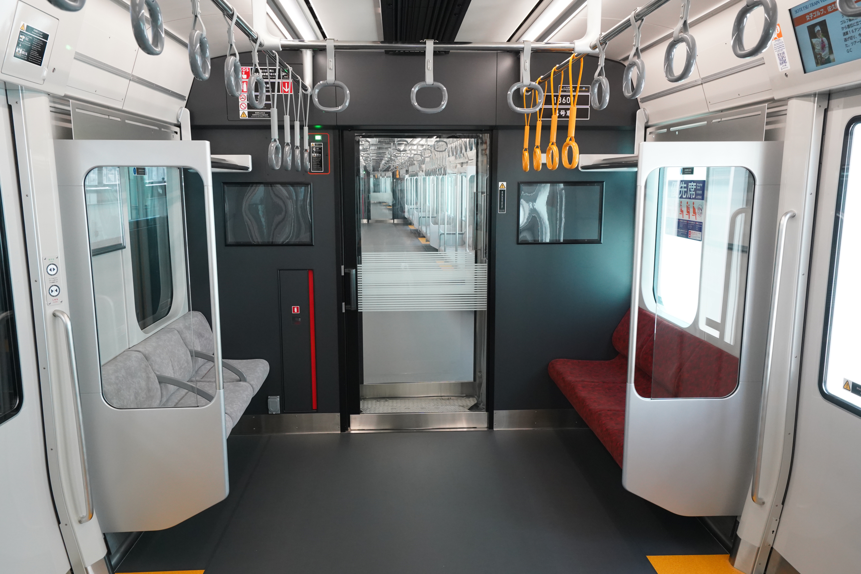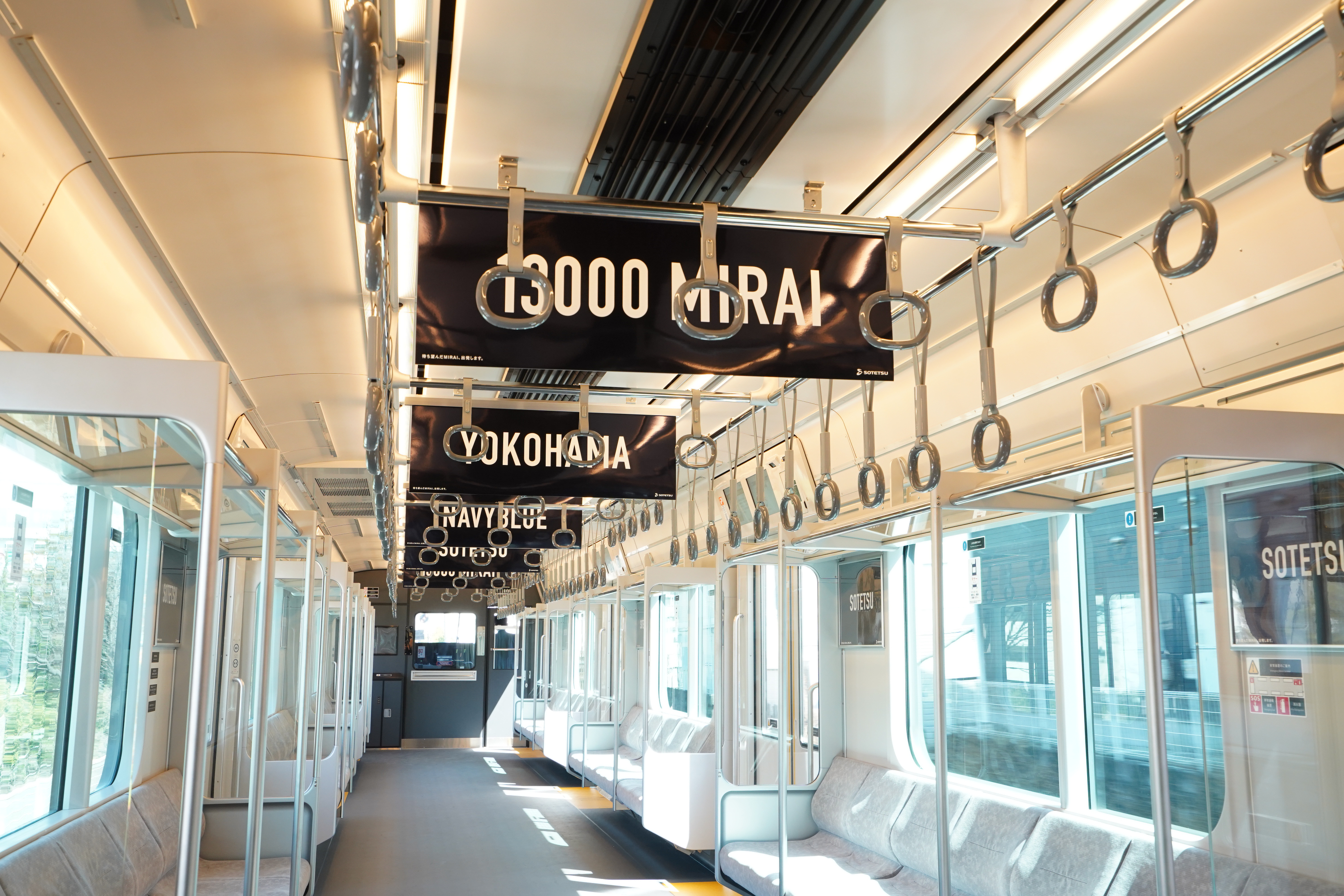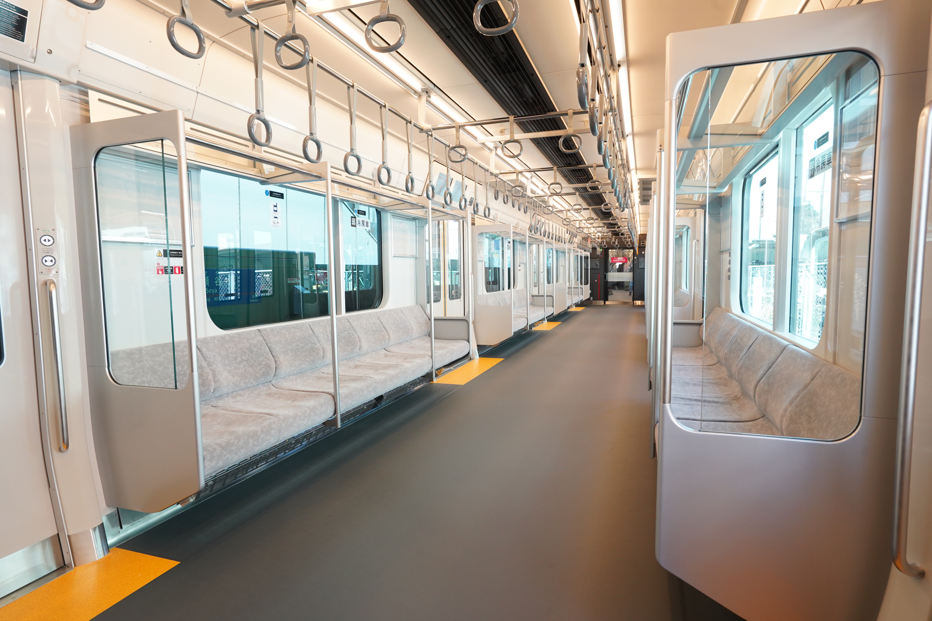 車内は、相鉄・JR直通線用車両「12000系」に比べて先頭車の座席数を6席、1編成あたり12席を増やしたほか、グレー色を基調にした内装で統一。12000系同様のガラス製の荷棚・仕切り・貫通扉の採用により、開放感のある室内となっています。