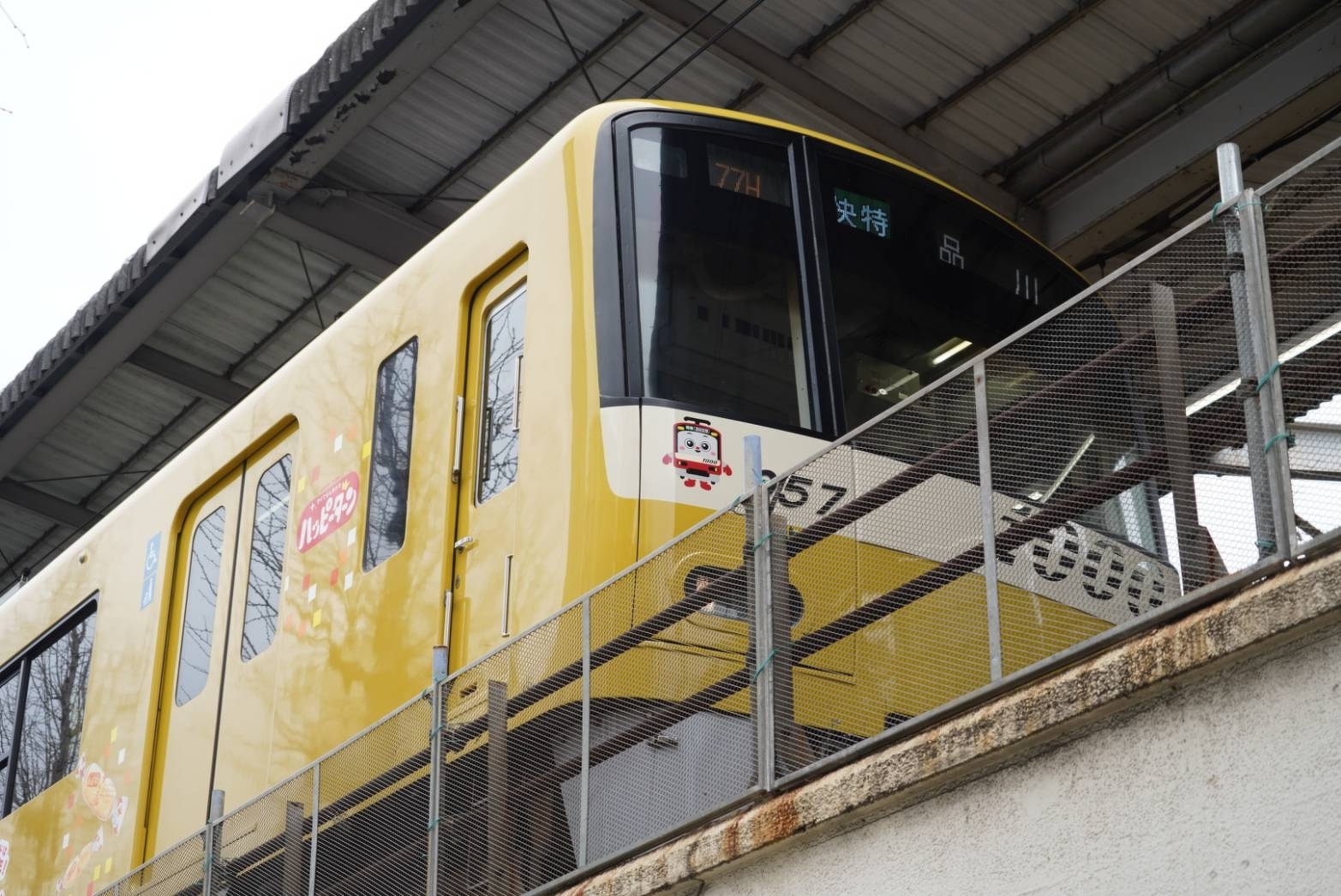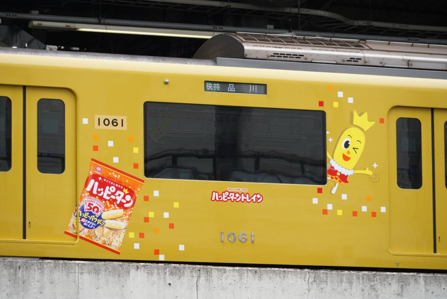 関東エリア 取材レポ 京急、ハッピーターントレインお披露目 公開 2026.03.23 Posted by 福岡えきちょう(福岡 誠) 2026年3月23日、京急の黄色い車体の編成「京急イエローハッピートレイン」に特別ラッピングをした『ハッピーターントレイン』がお披露目されました。 車内の中吊り広告部分には、実際の米菓「ハッピーターン」のように包装されたBIGハッピーターンも。 この『ハッピーターントレイン』は2026年3月23日より運行しています。 通販でも買えるようになりました!(表紙画像をタップ)