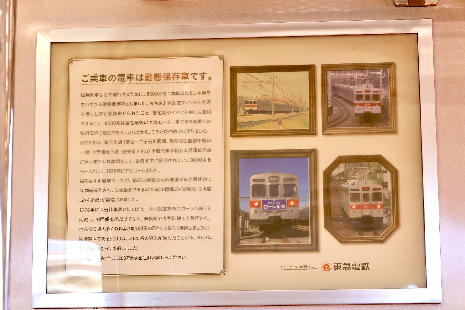 この車両は、2023年に引退した東急8500系車両のうち、最後まで活躍した8637編成を多客時やイベント時の運行、および職員への技術伝承を目的として2024年に動態保存したものです。