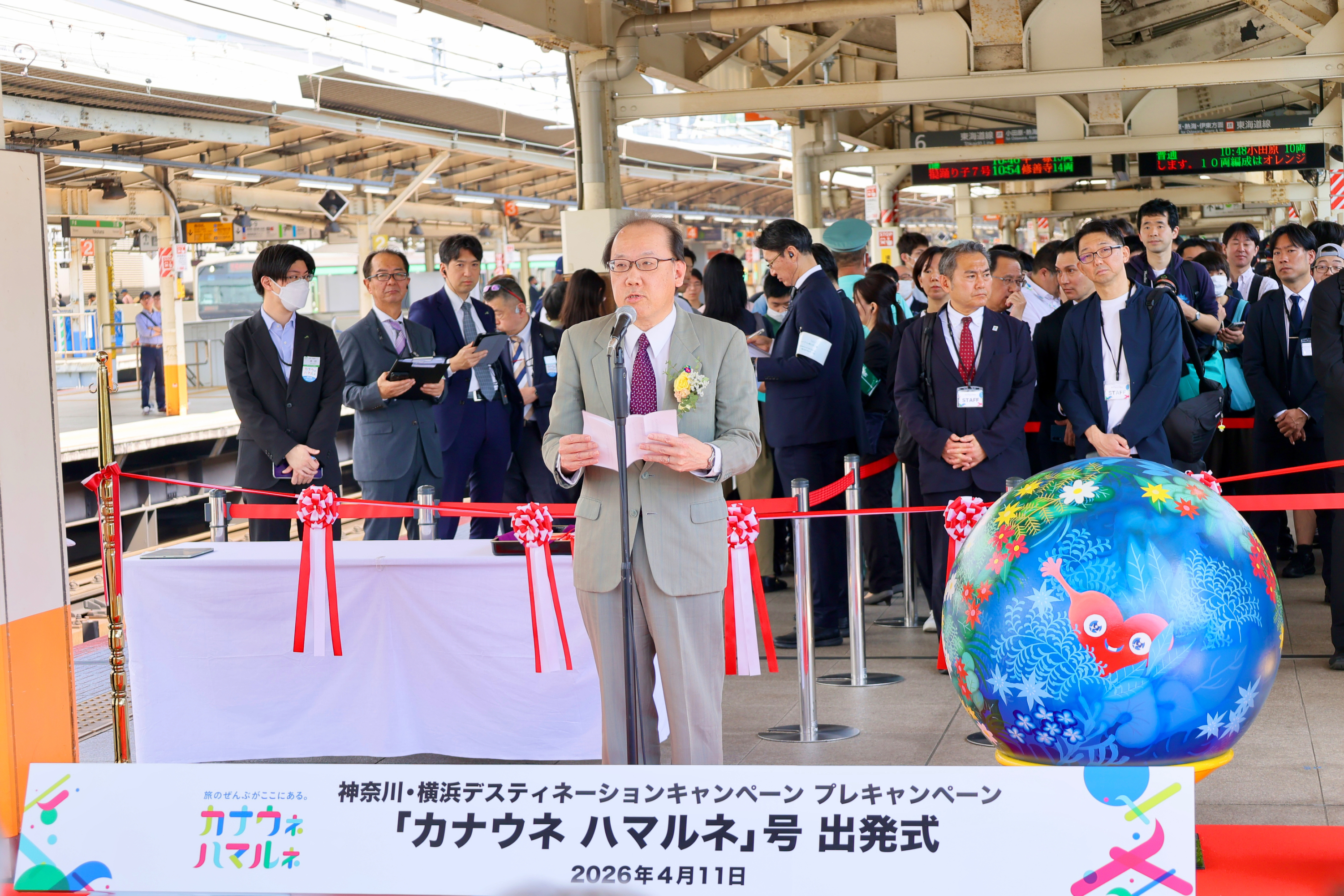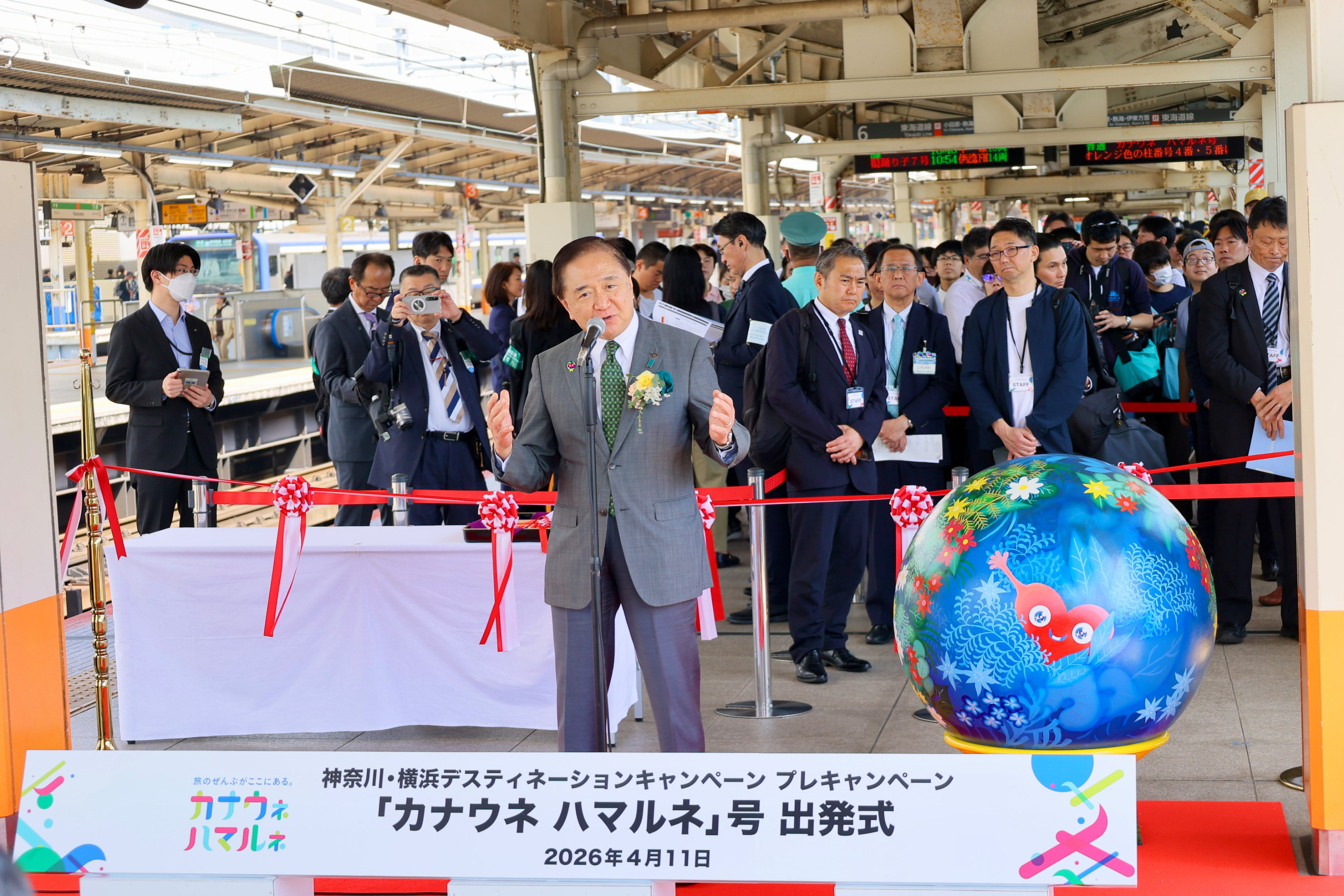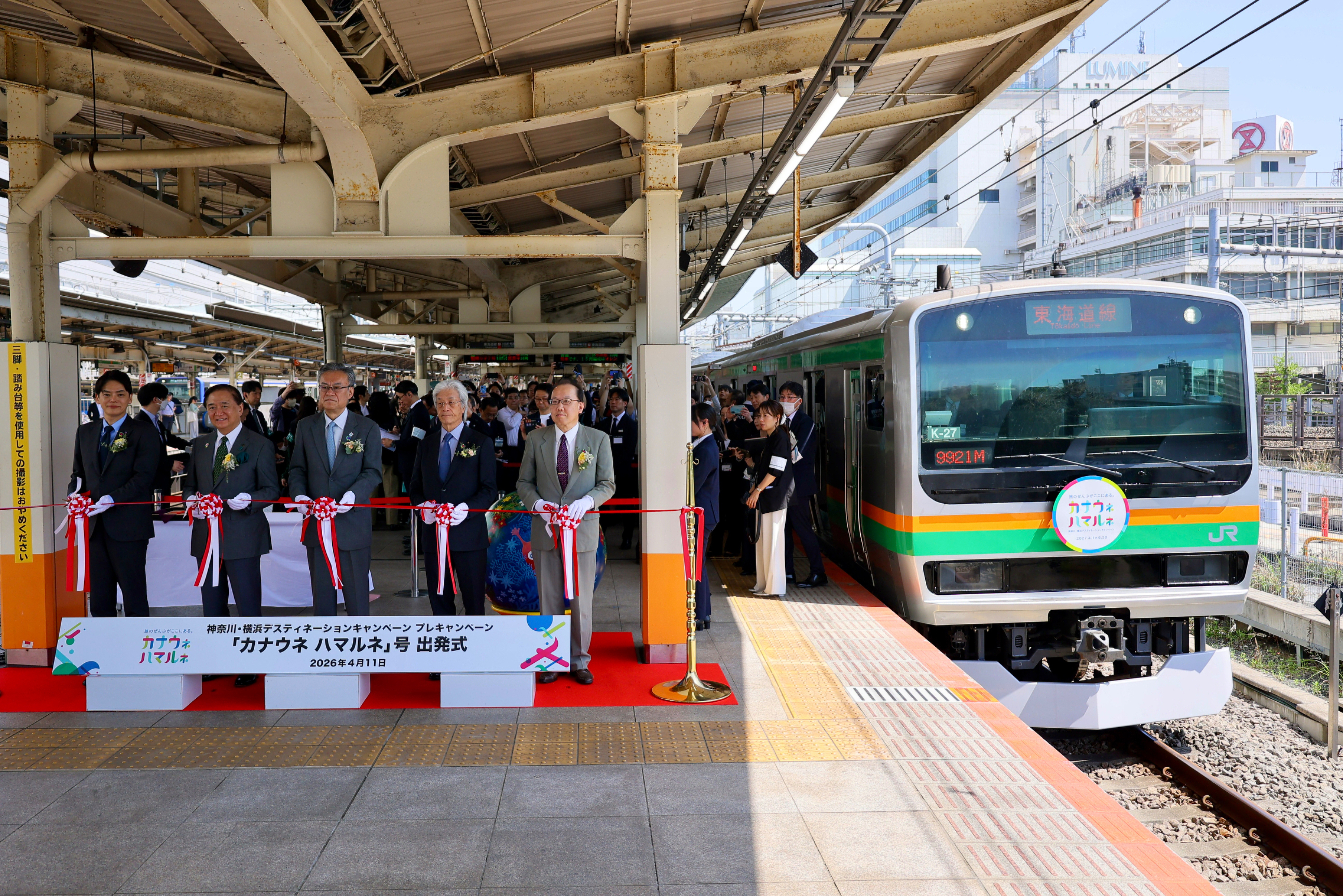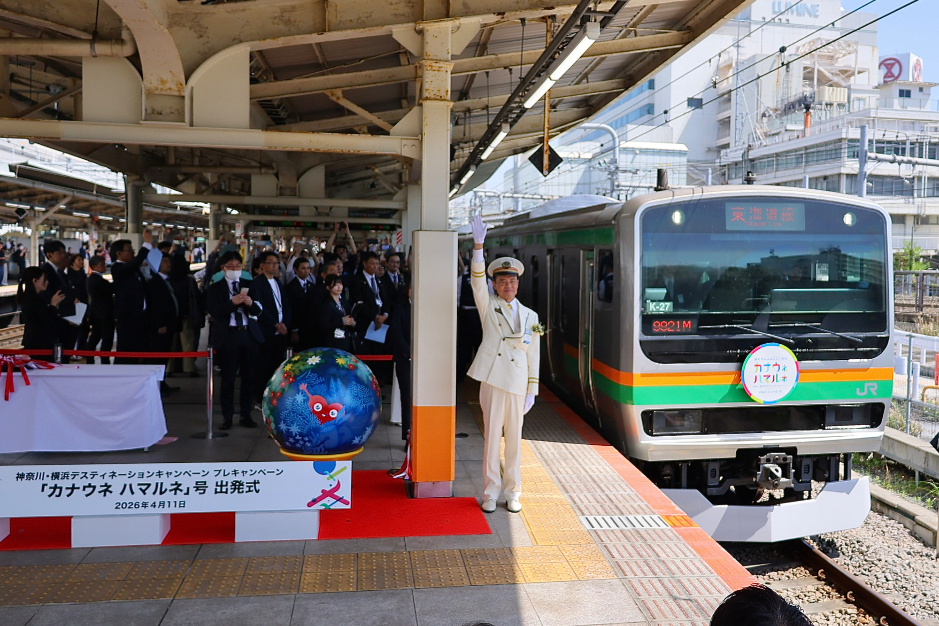 2026年4月11日、JR横浜駅で神奈川・横浜DCロゴデザインのヘッドマーク付き列車の出発式セレモニーが開催されました。