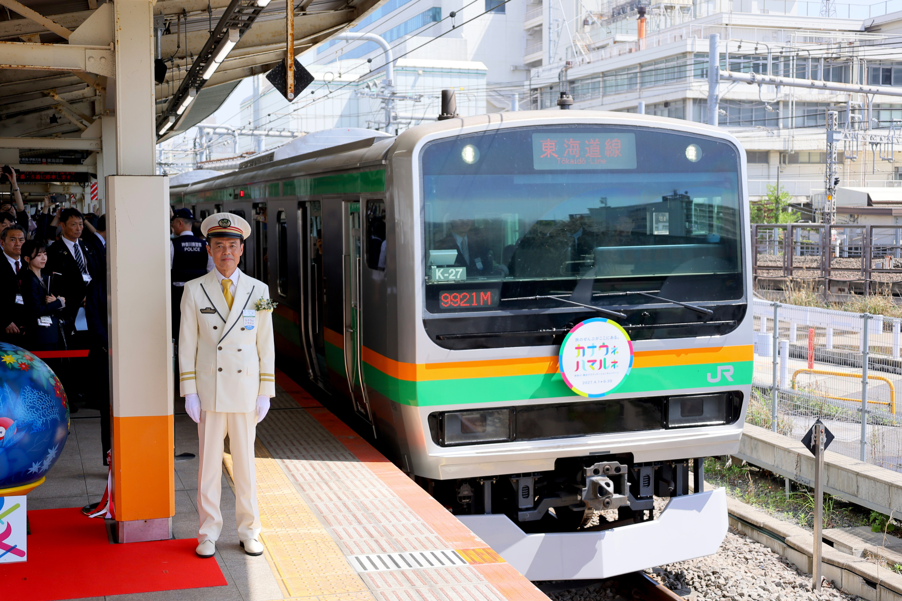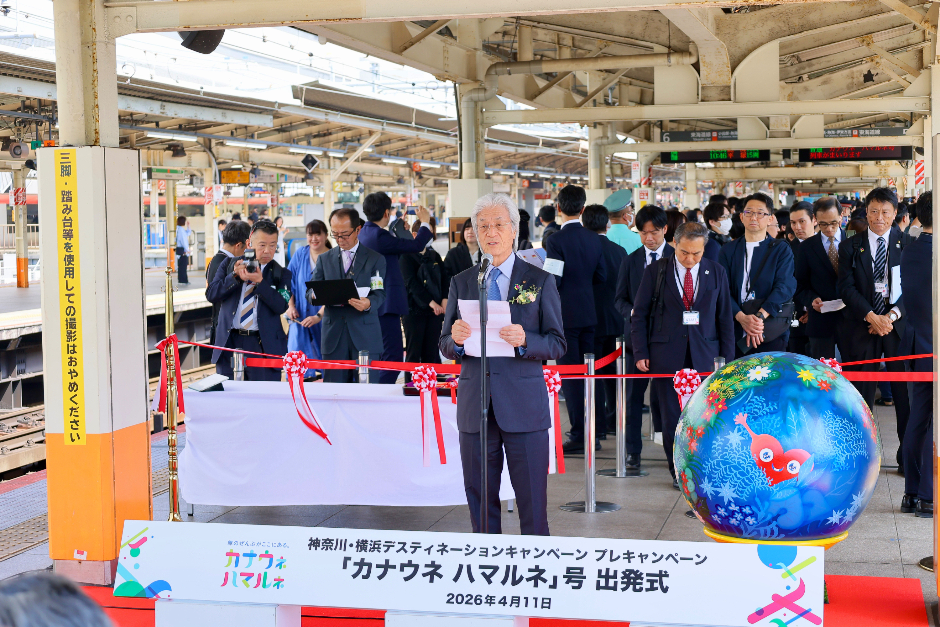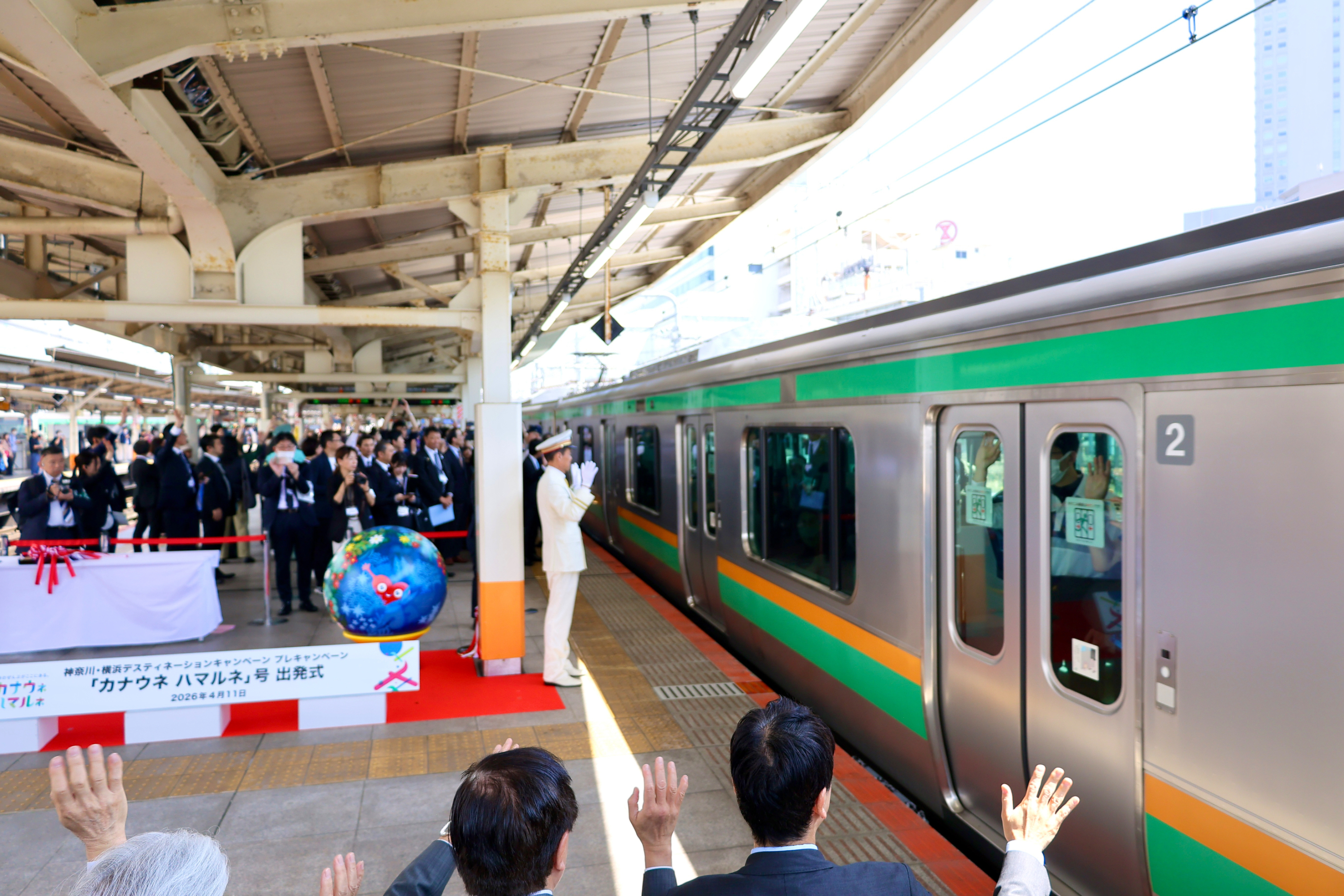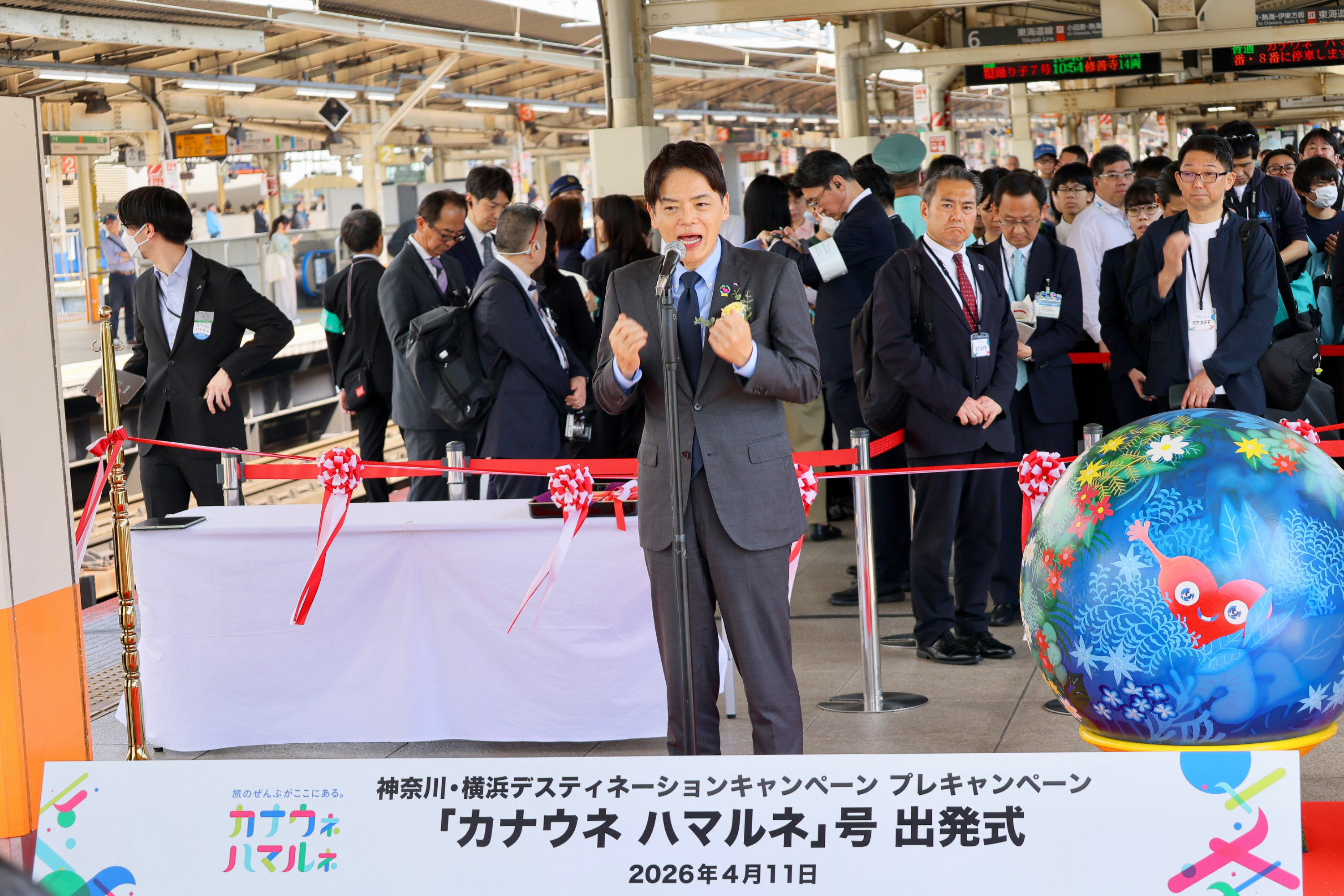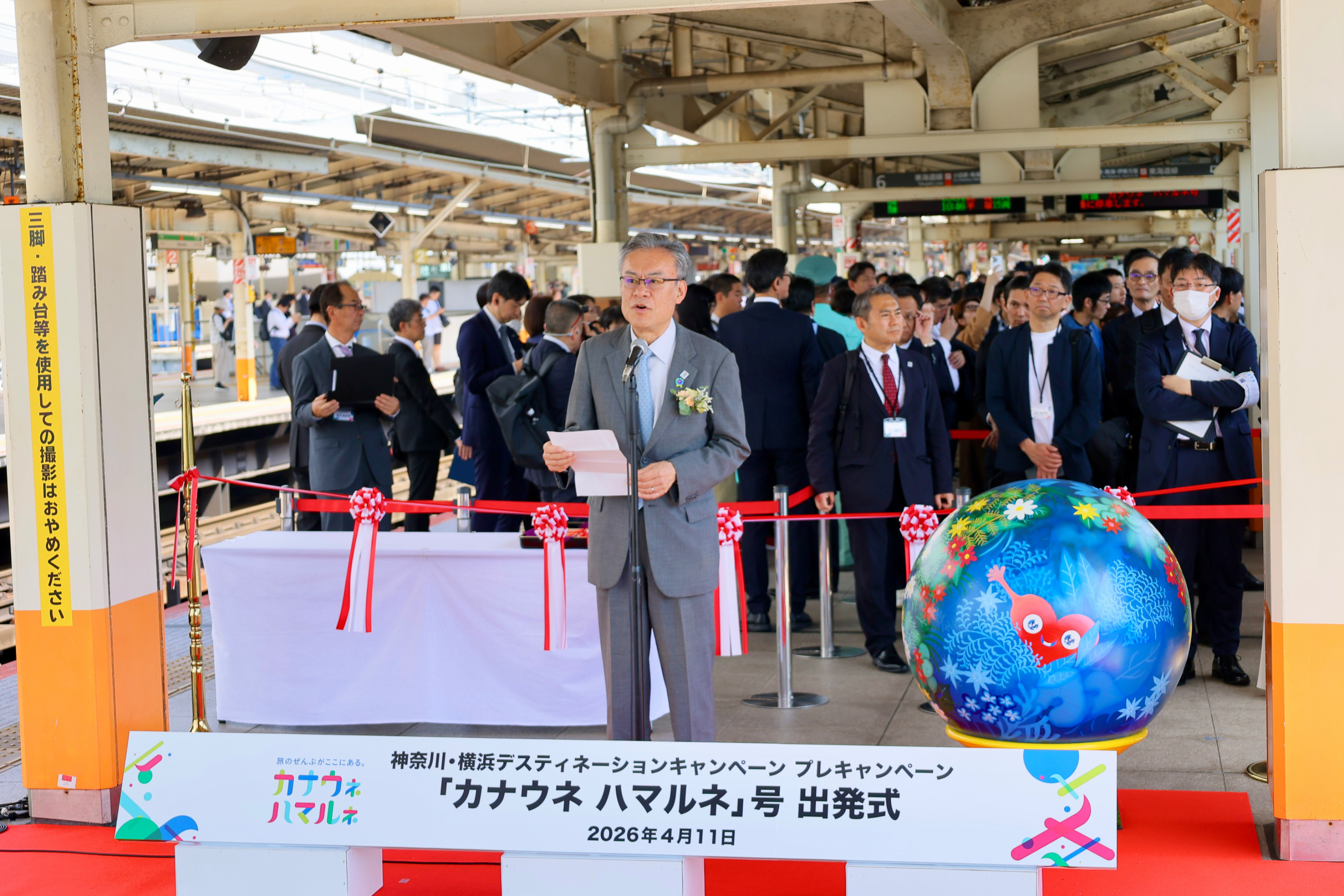 2026年4月11日、JR横浜駅で神奈川・横浜DCロゴデザインのヘッドマーク付き列車の出発式セレモニーが開催されました。