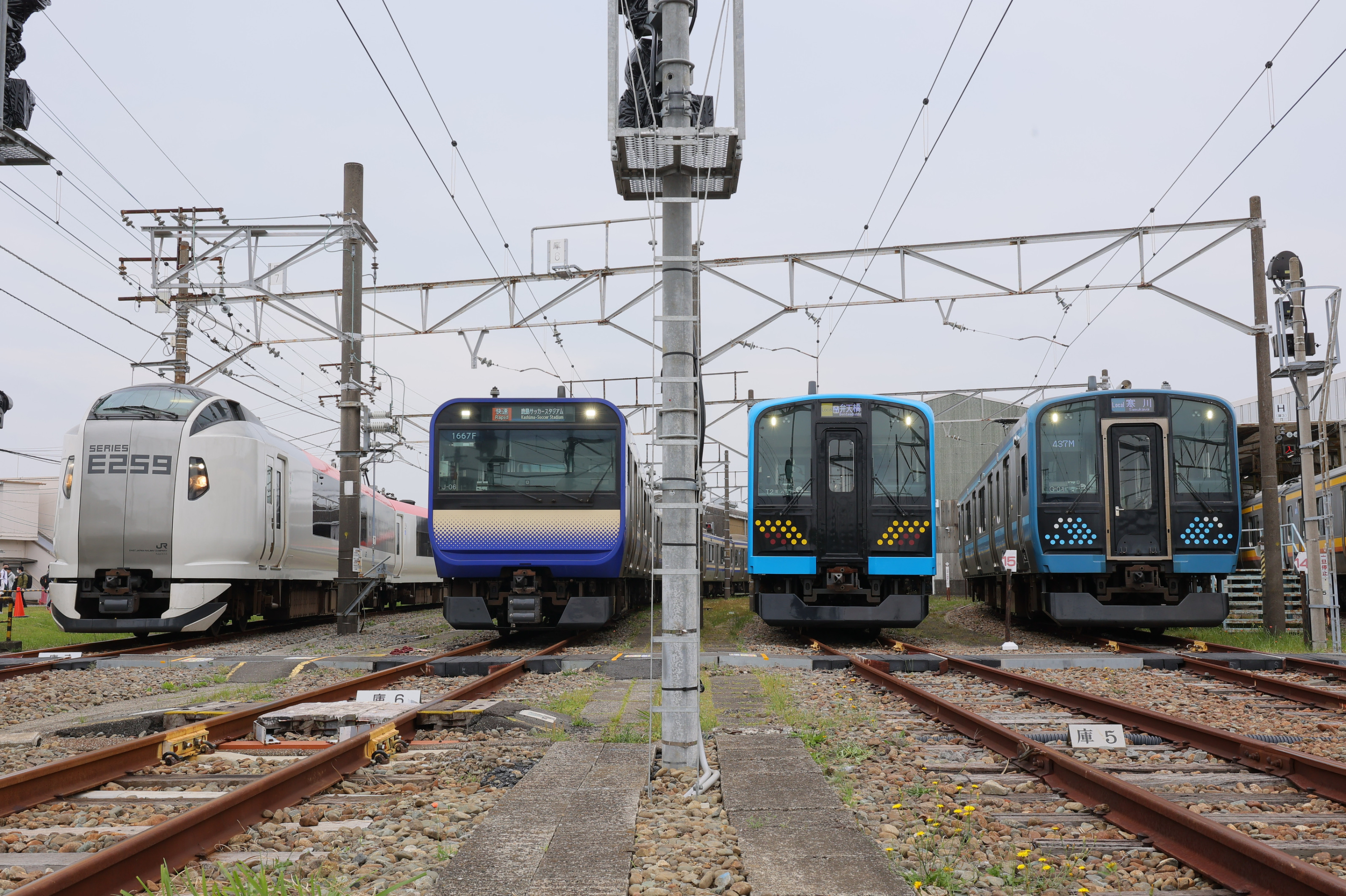 当日は、成田エクスプレスE259系・横須賀線E235系・鶴見線E131系・相模線E131系・南武線E233系・横浜線E233系・東海道線E233系が横一列に並びました。