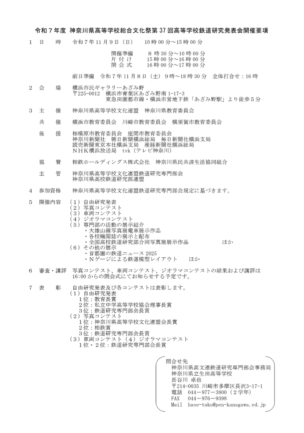 子鉄イベント 小学生対象 大人も対象 関東エリア 鉄道イベント情報 11/9 神奈川県 高等学校鉄道研究発表会を開催へ 公開 2025.09.24 Posted by 鉄道新聞 日程など 日時:2025年11月9日(日) 場所:横浜市民ギャラリーあざみ野 申込:不要 詳しくはこちら(公式リンク) 神奈川県高等学校文化連盟