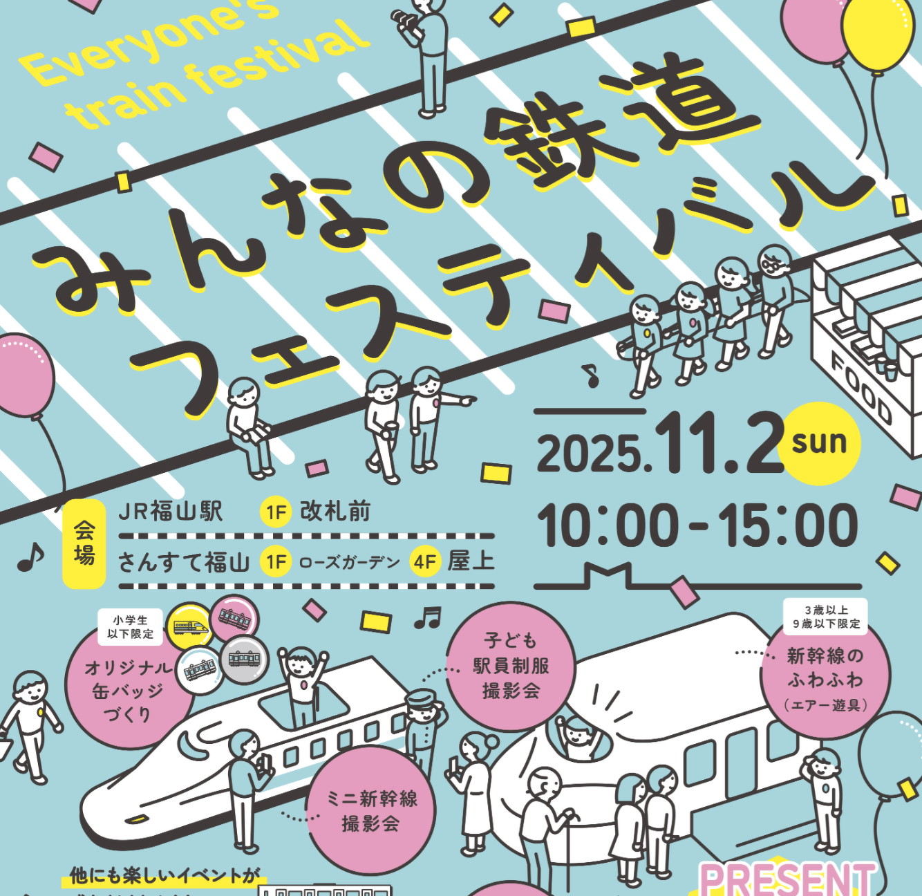 子鉄イベント 小学生対象 未就学児対象 中国エリア 子鉄イベント情報 11/2【JR西日本】JR西日本グループ会社の共催イベントを福山駅とさんすて福山にて開催 公開 2025.10.22 Posted by 鉄道新聞