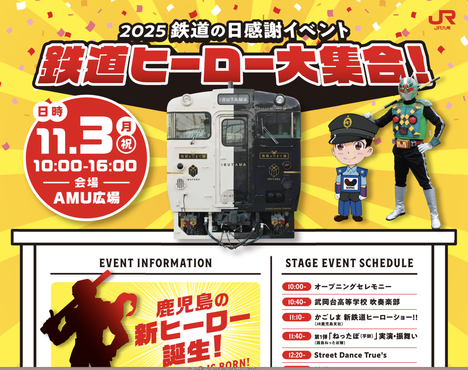 子鉄イベント 小学生対象 未就学児対象 九州南部エリア 子鉄イベント情報 11/3【JR九州】家族で楽しめるイベント「鉄道ヒーロー大集合!」開催 公開 2025.10.22 Posted by 鉄道新聞