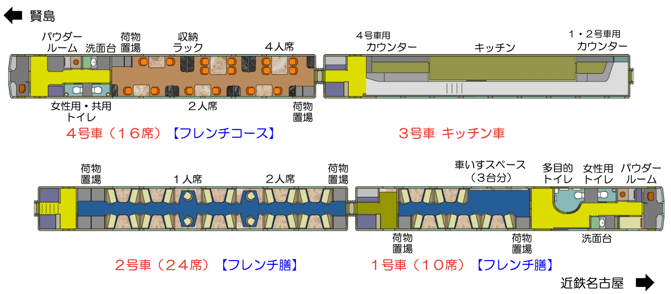 特急車両(12400系)4両1本を改造。4号車では、志摩観光ホテル樋口総料理長が監修した「フレンチコース」、1・2号車では近鉄・都ホテルズが監修した「フレンチ膳」が楽しめます。気になる料金は、「フレンチコース」が乗車料金を含めて2万円台後半、「フレンチ膳」が乗車料金を含め1万円台後半を想定しているとのことです。週6日ほど走ります。