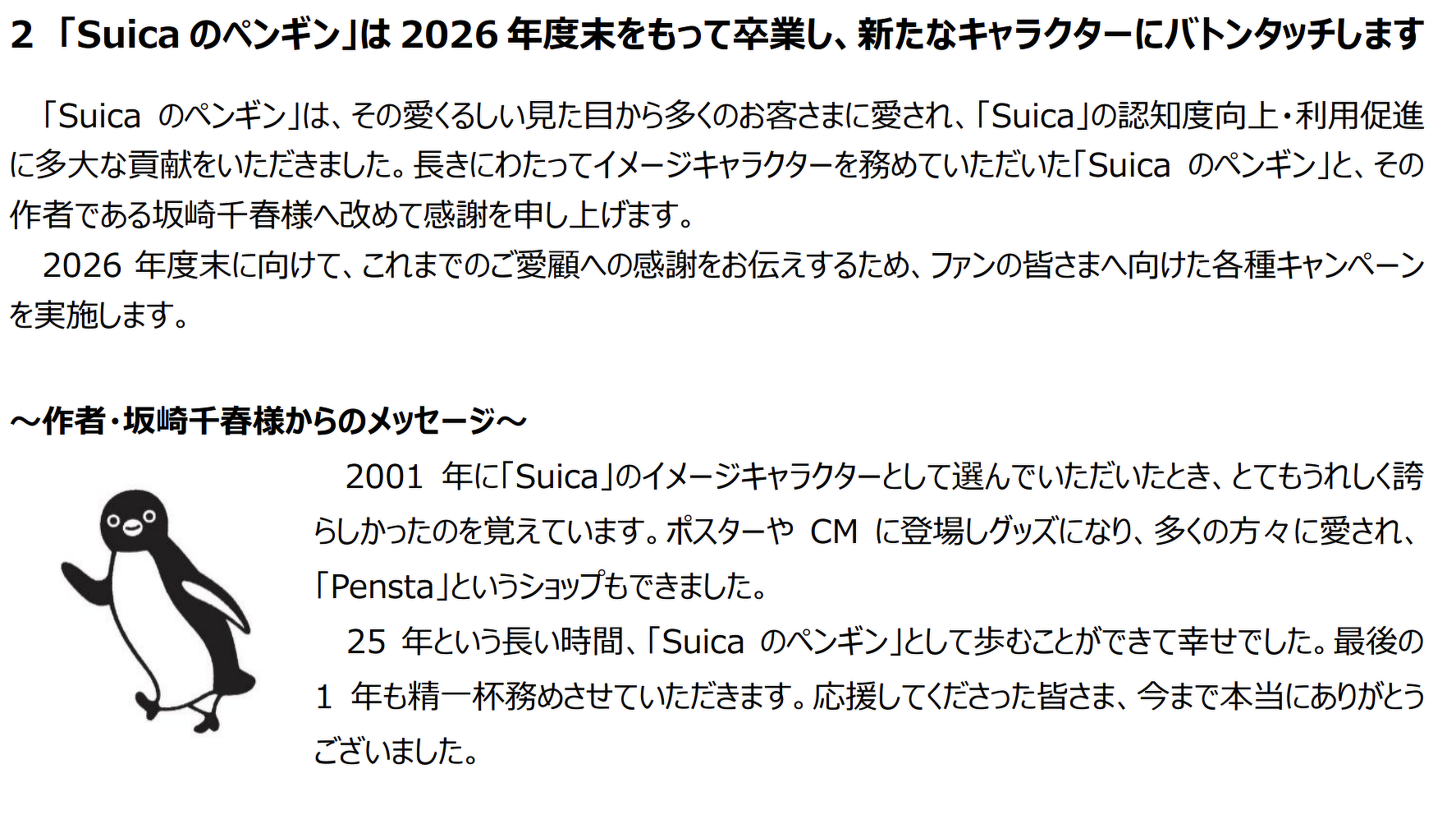 鉄道ニュース 鉄道ニュースヘッドライン Suicaのペンギン、2026年度末をもって卒業へ 公開 2025.11.11 Posted by 鉄道新聞 JR東日本ニュースリリースより 日時など 卒業時期:2026年度末 詳しくはこちら(公式リンク) JR東日本ニュースリリース