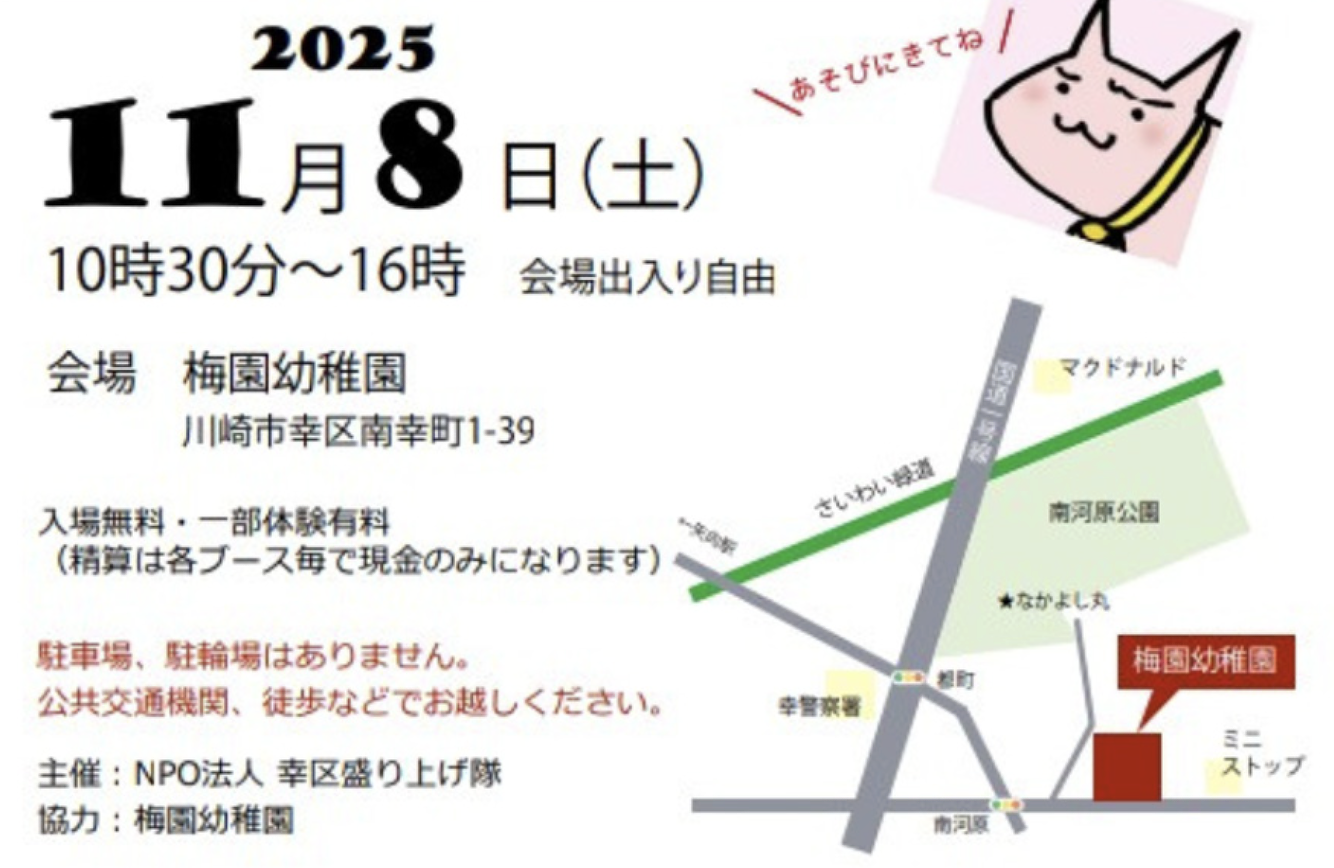 2025年11月8日(土)10:30〜16時、鉄道新聞社の地元である『川崎市幸区』内の幼稚園(梅園幼稚園)にて開催されるイベント「幸盛(さちもり)大博覧会」に日本子鉄協会が出店します!