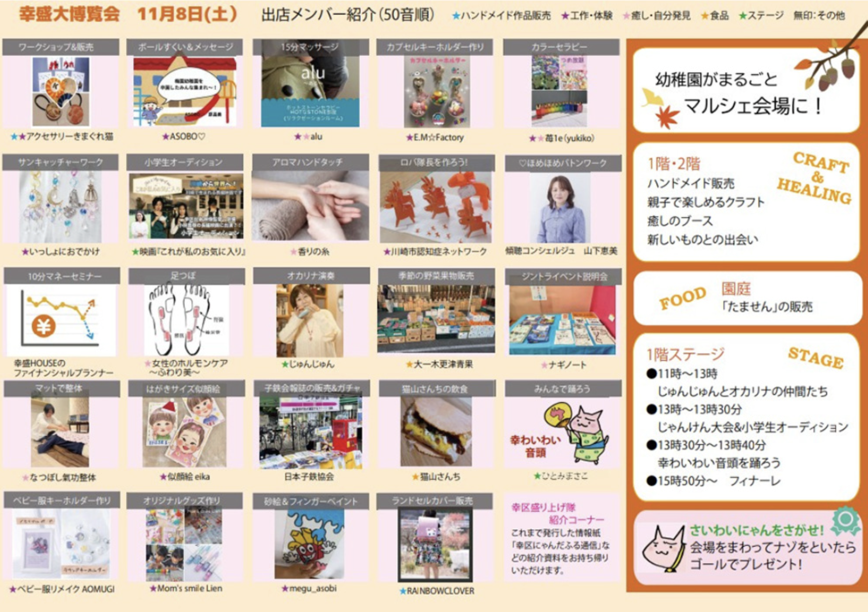 ワークショップ、販売、マッサージなど癒し、飲食、オカリナ演奏発表会、セッション、幸わいわい音頭などなど1日楽しめます!